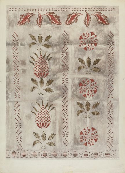 Curator: Mildred E. Bent created this intriguing piece, "Stencilled Wall," sometime between 1935 and 1942. The media employed includes watercolor, stencil, and pencil, yielding a kind of ghostly image. Editor: Ghostly is spot on. It has a melancholic, faded beauty, doesn't it? Like a memory clinging to a dusty attic wall. The muted palette, especially the browns and faded reds, amplifies that feeling. I almost sense the presence of a home that once bustled with life. Curator: It’s tempting to see this through a purely aesthetic lens. However, when we consider that this work falls under the umbrella of folk art and decorative art, certain cultural connotations emerge. The stenciled patterns, the floral motifs, the repetition, evoke domesticity. Perhaps Bent aimed to capture an ideal, or even the reality, of home life from that period. Editor: Interesting. So, instead of just being decorative, those choices tap into deeper collective notions about homemaking and comfort? That cornice or canopy across the top is particularly interesting. Those forms remind me of early American fabric designs or bed hangings...something to do with a bed, perhaps sleep itself, definitely contributes to the feeling. Curator: Precisely. Symbols are deeply entwined with social expectations. Consider the meticulous rendering—almost obsessive in its patterning—paired with the fact that she's using what might be considered a craft or traditionally "feminine" art form. Editor: Yes! And there’s an almost defiant beauty in its ordinariness. The kind of beauty you might easily overlook in everyday life. It’s the sort of aesthetic choice someone makes when trying to soften or claim even the humblest domestic space. Curator: Looking at "Stencilled Wall" then, we recognize the lasting cultural power inherent in commonplace images, things repeated and inherited over generations, shaping even something like domestic identity and taste. Editor: Absolutely. I come away from it with a deep appreciation for the silent language of patterns, the untold stories living on the walls we often don't truly "see." A nice little jolt to wake us from the sleep of familiarity!