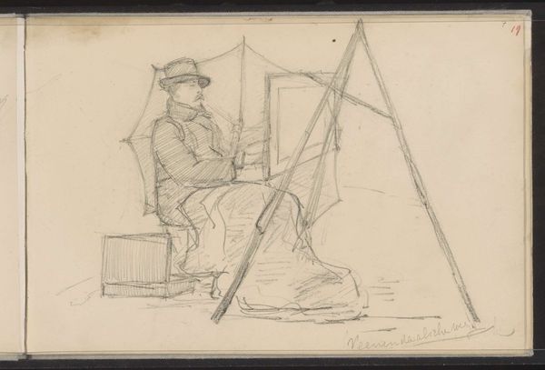 Editor: So, here we have Johannes Tavenraat's "Jachtopziener Adrianus Sebel in de eendenhut," made between 1864 and 1868, using ink, charcoal, and watercolor on paper. It's a striking double portrait. I’m initially struck by the contrasting depictions of the same man. How do you interpret this work? Curator: What I find most compelling is the implicit dialogue between man and nature, framed through the lens of class and labor. Consider the context: mid-19th century, a period of rapid industrialization and urbanization, yet this image focuses on the rural, on hunting as a profession. How might we view Sebel’s position in this societal shift, a figure literally obscured by reeds, marginalized yet essential to the landed gentry? The differing portrayals, one active, one passive, highlight a tension between agency and subordination. Editor: That's a fascinating perspective! I hadn't considered the socio-economic implications so deeply. The reeds do seem to confine him. Curator: Exactly. Consider the act of hunting itself: it’s not merely about sport, but also about power dynamics, about who has the right to exert control over the natural world, and who is employed to facilitate that control. How does that change our view of Sebel? Is he a participant, or an instrument? The very composition implies he’s being watched, surveilled within his own environment. Editor: That's really given me something to think about. I was initially drawn to the romantic style, but now I see the deeper layers of social commentary. Curator: Precisely! By interrogating these representations, we can begin to unravel the complex relationships between humans, labor, and the environment.