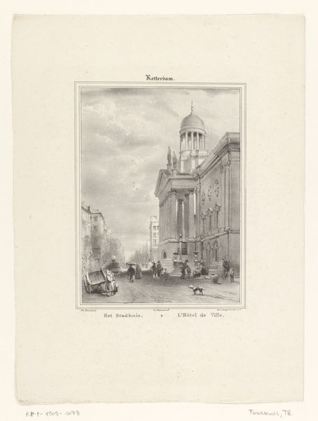 Charles Rochussen captured this view of the Town Hall in Rotterdam using pen and brush in grey on paper. Rochussen, who lived through a period of significant social and political change in the Netherlands, often depicted scenes of everyday life. This drawing offers a glimpse into the urban environment of the 19th century, revealing not just the architecture but also the people who animated the space. Consider the figures in the foreground, likely members of the working class, going about their daily routines against the backdrop of the imposing Town Hall. The Town Hall, a symbol of civic authority, contrasts with the ordinary lives unfolding before it. In his broader body of work, Rochussen skillfully captured the nuances of Dutch society. Here, he invites us to contemplate the relationship between the governing structure and the community it serves. It prompts reflection on how spaces of power and governance intersect with individual experiences and the collective identity of a city.
