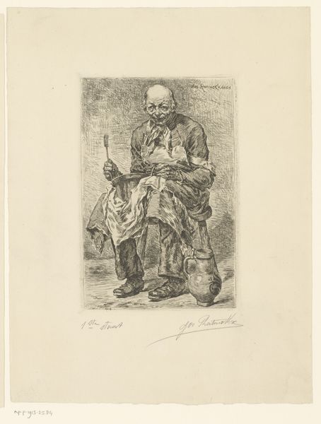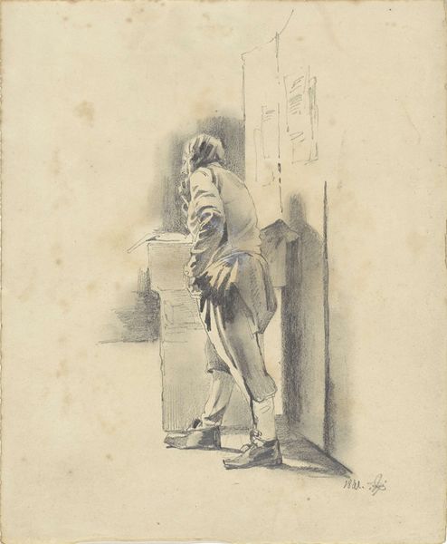 Editor: Here we have Pieter van Loon’s 1838 pencil drawing, “Zittende jongen, in interieur,” housed here at the Rijksmuseum. It depicts a young boy sitting rather stiffly in an interior setting. The lighting and the boy’s expression give it a solemn mood, but I’m not quite sure why. What do you see in this piece that I might be missing? Curator: Well, let’s consider the time this was created. It was the era of Romanticism. Even seemingly simple genre scenes like this were loaded with social meaning. What do you notice about the boy's clothing and posture? Editor: He is wearing quite plain clothes and he is sitting very upright, almost unnaturally so. Is this intended to convey something specific about the boy’s position in society? Curator: Exactly! While the details are sparse, the emphasis on posture and the plainness of dress speaks to a deliberate effort to portray a certain ideal of childhood—likely tied to contemporary notions of discipline and morality promoted by institutions and those who commissioned these works. Where do you think this piece might have originally been displayed? Editor: Perhaps in a wealthy patron’s home or possibly within an institution focused on educating young people? Was the intent to present an ideal or a standard of behavior? Curator: Precisely! It reflects the prevailing societal norms and the role of art in shaping and reinforcing them. Consider how this image contrasts with depictions of children from earlier periods. It invites a commentary on childhood and social status, wouldn't you agree? Editor: It’s amazing how a simple pencil drawing can hold so much about the society it was created in. Curator: Indeed. It challenges us to see beyond the aesthetic and consider the political and social dimensions embedded within even the quietest of scenes. Editor: I’ll never look at another genre scene the same way again!
