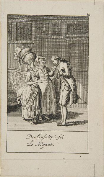 Editor: Here we have Daniel Chodowiecki's "Illustration for 'Wedding Proposals': The Cobbler," a small yet incredibly detailed print. I'm struck by the contrast between the formality of the figures and the everyday setting. What do you see in the composition that might enhance this tension? Curator: Observe how Chodowiecki employs a delicate line to define form. The meticulous rendering of the cobblestones and the clothing contrasts with the open space, drawing attention to the central figures. Notice how the texture adds depth, emphasizing the materiality of the print itself. Editor: So, it’s as much about the technique as it is the narrative? Curator: Precisely. The very act of looking closely reveals the artist's command of the medium and compels us to consider the aesthetic choices at play. It’s in this interplay of line, form, and texture that the work truly speaks. Editor: That’s fascinating. Thanks for pointing out those details! Curator: My pleasure. There’s always more to see if we look closely and consider the formal elements.