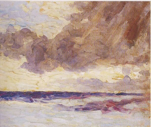 Editor: So, this is Tom Roberts' "Sunrise," painted in 1929, with oil on canvas. The bottom half is all dark, then there’s this ghostly horizontal line, and the sky is just exploding with warm colors. It's pretty stark. What are your first impressions? Curator: It’s like looking into the soul of a new day, isn’t it? Roberts really captures that raw, untamed energy of dawn. It’s interesting how he uses such bold horizontal bands, almost like emotional strata. The dark foreground could represent the night receding, the pale line, anticipation... It makes you wonder, what is about to emerge from the dark? Editor: I didn't even think about it like that, but the anticipation of the morning is cool. And those fiery oranges... do you see any connection to other impressionist landscapes? Curator: Oh, absolutely! Think about Turner's skies, that same almost spiritual quality, but with a very Australian twist, wouldn’t you say? Roberts takes that painterly language and applies it to the bush. Plus, there's something intensely personal about his landscapes. Almost as if he were painting his own emotional landscape. Don't you feel it too? Editor: I definitely see that emotional rawness now, especially how the heavy dark paint makes the sunrise colors look more alive. Curator: Precisely! He allows us to project our own narratives onto the canvas, and discover things hidden beneath that dark foreground, it truly transcends a mere depiction of nature, becoming more an allegory. Editor: Well, that’s something I’ll never look at the same way again. It went from being just a sunrise to a story about hope and change. Curator: Indeed. Roberts was onto something profoundly human. And hopefully this conversation sparked our understanding of the sublime of the sunrises to the inner canvas of emotions.
