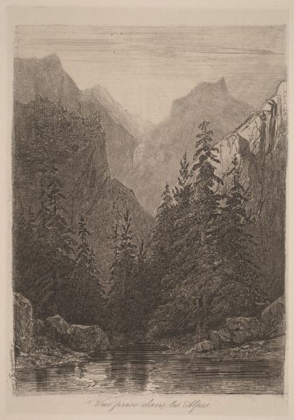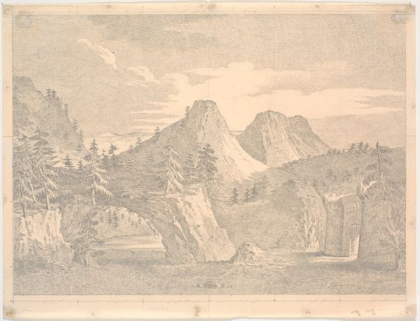 Curator: J.L. Lund’s 1801 drawing, "Et vandfald ved St. Pierre d'Entremont, Grand St. Bernard. Schweiz" captures a waterfall cascading through a rugged landscape. Lund renders this scene with pencil and watercolor. Editor: My first impression is the almost monochromatic mood. It feels incredibly stark, yet serene, like nature holding its breath. Curator: Yes, it's quite subdued, isn't it? Waterfalls were potent symbols for Romantic artists like Lund. Water's ceaseless flow represented the relentless passage of time, the overwhelming power of nature against which humanity is humbled. Think about the context of the Napoleonic Wars. Artists sought refuge in these natural representations, distancing themselves from immediate political unrest and aligning themselves with ideals of the sublime. Editor: That makes sense, looking at the delicate rendering, but I also think there's a very specific sense of precarity visualized here. Waterfalls can signify purification or even danger depending on how they're used symbolically. I wonder if the small house positioned precariously in the mountains suggests how vulnerable human constructions are within the natural world? Curator: A relevant interpretation. The Sublime emphasizes not just awe, but also terror. It became popular at the moment artists started addressing environmental risks brought by expanding cities and manufacturing. Editor: Absolutely, the cultural memory associated with unspoiled nature had a lot of symbolic value for folks then, much as it does now. But it also made these sites magnets for artists looking for inspiration, making sites like St. Pierre d'Entremont cultural touchstones in themselves. It becomes an image that’s as much about a real place as about an idea of what “nature” ought to be. Curator: Precisely. Art became a way for people to engage with both natural reality and philosophical ideas that challenged the social structure and the art market itself, if you consider those like Lund who tried, through art, to transcend academic art practices and market-oriented workshops. Editor: It is fascinating to consider how such a muted scene holds so much roaring beneath the surface. Curator: Indeed, a small artwork encapsulating monumental shifts in both art and societal perceptions.