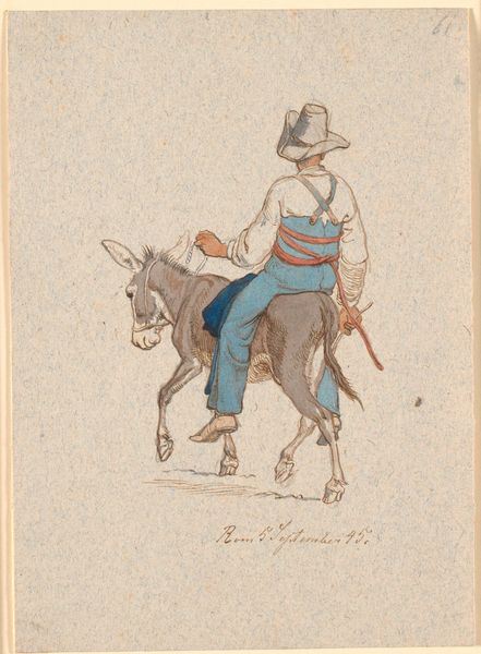 Curator: Johan Thomas Lundbye's watercolor drawing, "An Italian Farmer with His Son, Sitting on a Donkey," created in 1846, offers us a glimpse into rural life through a Romantic lens. What's your first take? Editor: The delicate washes give it a sense of sun-drenched stillness, doesn’t it? And the almost caricatured figures invite an immediate connection. What can you tell me about the context? Curator: Absolutely. Lundbye was part of the Danish Golden Age, when artists sought inspiration in both national identity and wider European culture. Italy, of course, was a popular destination. He's portraying, in a sense, an idealized peasant class. His work fits into a larger narrative that involves themes of social justice, and how identity gets represented. These peasants of Southern Europe, often rendered through idyllic, soft painting styles. Editor: The donkey, naturally, would immediately evoke the biblical connotations of humility and poverty. Its representation here makes me think about art historical trends representing farm animals over centuries: it feels related, even distantly, to images of the Holy Family traveling on donkeys. Curator: Good point. While these tropes existed, there's the critical aspect to consider too. It raises questions: what does it mean for a relatively privileged Danish artist to depict the daily lives of Italian peasants? Are we truly getting an unvarnished glimpse of reality, or is Lundbye reinforcing class divisions? Editor: It does provoke consideration on multiple symbolic levels. You know, from their somber, slightly world-weary expressions to their sun-baked skin tones, they communicate both hardship and perhaps a quiet resilience. The son, with his red hat, mirrors in the overall color story to that of the father’s draped garment—perhaps reflecting cycles of inherited identity. Curator: I agree. The work becomes not just a landscape piece or genre painting, but a study in cultural representation and perhaps a critical engagement with notions of privilege. How do we view art, and the gaze through which we approach this representation? Editor: Ultimately, images like this compel us to keep reassessing how visual representation informs identity and memory. It certainly encourages a richer interpretation of our shared, visual past.