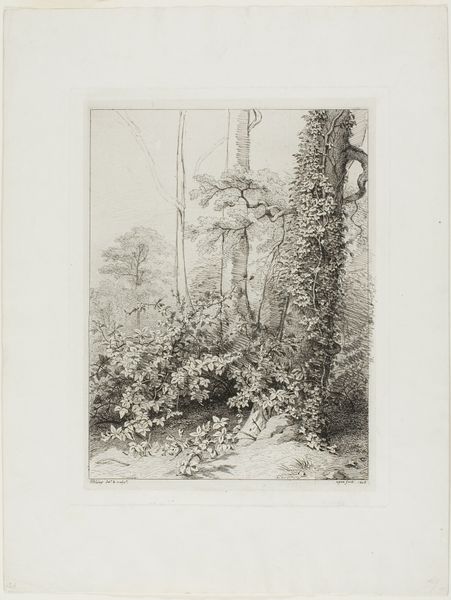 Editor: Here we have Eugène Blery's "Bramble and Ivy," an etching from 1845. It is a black and white print of a tree and other plants. I'm struck by the incredible detail in such a small work. What catches your eye when you look at this piece? Curator: Initially, I am drawn to the compositional structure. The artist masterfully employs a high degree of linear precision, especially within the representation of the flora. Notice the differing densities and rhythms of the etched lines; they guide the eye through a sequence of visual contrasts between the texture of the tree trunk and the delicate nature of leaves and vines. Editor: So, it's about the line work and composition above all? Curator: Precisely. Consider the interplay between the structured clarity of the primary tree form and the almost chaotic dispersion of foliage towards the lower register. This dichotomy creates a fascinating visual tension. Also, reflect upon the function of light and shadow; they don't merely illuminate but construct form itself. Editor: It's interesting how the close observation transforms what I initially saw as a simple nature study into this dynamic composition. It's more than just pretty foliage, it’s organized. Curator: Indeed. Focus on how Blery manipulates the medium of etching to suggest depth, atmosphere, and tactile qualities, essentially redefining nature through structured representation. The true essence lies not just in what is depicted, but in *how* it is depicted. Editor: I see what you mean! Looking at the piece as an orchestration of lines and contrasts clarifies how the medium informs the subject. It is really incredible, I've learned a lot today. Curator: A worthwhile exploration! Considering a work’s formal qualities provides a strong foundation for broader interpretations.