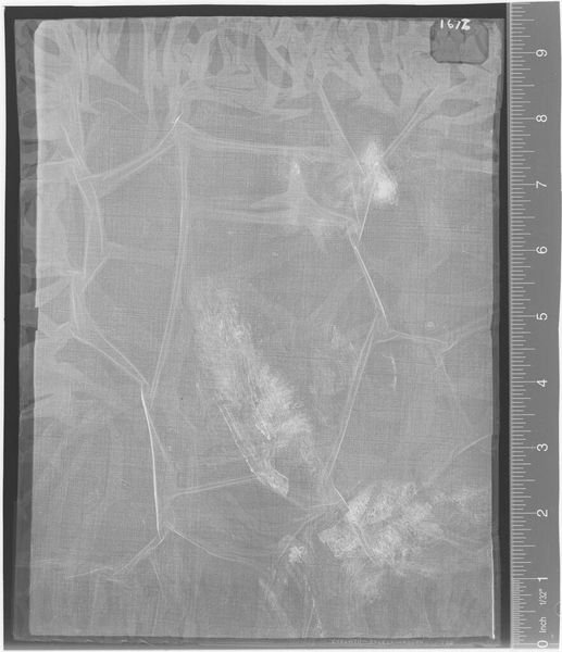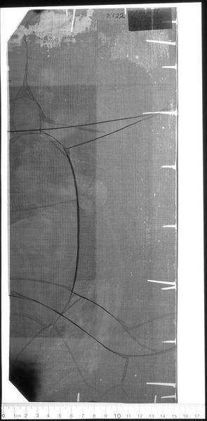 Editor: Here we have an X-radiograph of "Portrait of a Little Girl" by Cornelis Vos. It’s quite unusual to see a painting rendered this way. What does it tell us? Curator: The x-ray reveals the artist's process. We see the underlayers, the buildup of paint, and structural supports. The history of making and materiality is literally laid bare. Where was this painting made, and by whom? Editor: I don't know the specifics in this case, but I suppose this x-ray gives us insight into the labor and resources that went into creating the work. Curator: Exactly. It redirects our focus from the finished image to the act of creation, its economic context, and the very physicality of the materials. Editor: That’s fascinating, I had not thought of it that way.