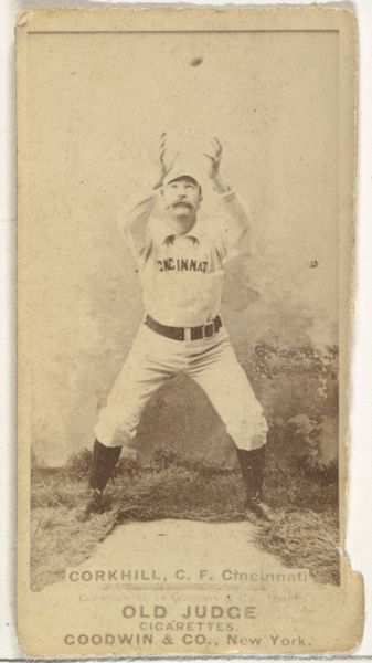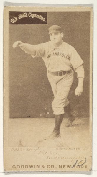 Editor: This is a fascinating artifact - a baseball card of Charles "Charlie" Parsons, a pitcher for Minneapolis, created around 1888. It's from the Old Judge Cigarettes series. It seems both like a portrait and advertisement, all in one small photographic print. How do you read this image? Curator: This card carries more than just baseball stats; it speaks volumes about the culture of the time. Look at the almost ritualistic pose. It's not simply a picture of a man; it's a carefully constructed representation of athletic prowess and early celebrity. Editor: Ritualistic, how so? Curator: The carefully held ball, the uniform presented just so...these elements function like the attributes of a saint in religious iconography. Parsons isn’t just a player; he embodies ideals of skill and perhaps even American values. The "Old Judge" brand piggybacking on that idealized figure is no accident, it's a strategic play into a cultural memory that values dedication and skill. Do you see the influence of Ukiyo-e prints? Editor: Vaguely - I can see how the framing and even sepia tones add to that suggestion. It’s quite distinct, right? Curator: Exactly! These cigarette cards were the internet memes of their time, democratizing celebrity and creating new symbolic language of consumerism tied with heroic figures. We can learn how heroes are fabricated and become culturally embedded in everyday life. Editor: That’s really fascinating, especially that link to modern media and advertising! It is also thought provoking when viewed as iconographic images that reflects cultural identity. Curator: Indeed! It highlights the ways we build and share common symbolic representations. It leaves me thinking how heroes, ideologies, and consumption converge across centuries.