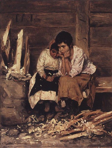 This small oil on canvas, "Two Pilgrims" by Vladimir Makovsky, presents an intimate study of two figures set against a muted landscape. Makovsky’s work is defined by a structured composition and close attention to materiality. The figures are rendered with visible brushstrokes, their forms emerging from a textured interplay of light and shadow. The subtle palette of browns, grays, and greens conveys a sense of solemnity, reinforced by the rough texture of the pilgrims’ garments and the coarse ground under their feet. Here, Makovsky uses these formal elements to reflect on the socio-economic conditions of late 19th-century Russia. The artwork destabilizes idealized notions of peasantry, instead offering a stark, realistic portrayal that invites viewers to confront prevailing social hierarchies. The piece thus prompts ongoing reflection on the relationship between representation, social critique, and the viewer's own position within broader cultural narratives.