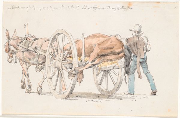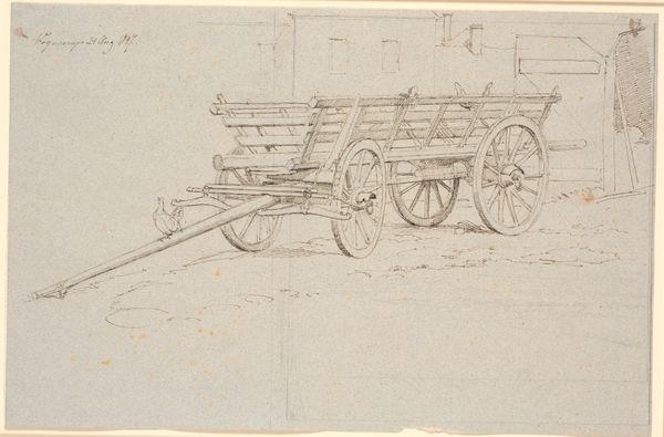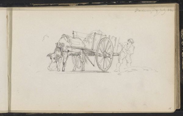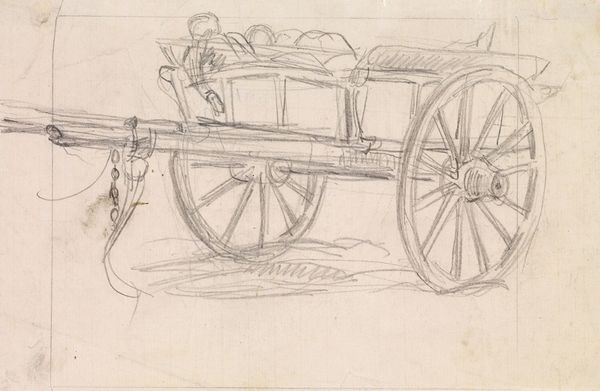 Curator: This is Johannes Tavenraat’s "Huifkar op de weg tussen Brussel en Parijs," a drawing created in 1840. Editor: My first thought? It’s incredibly delicate. The artist's pencil work captures the simple lines of the cart against the barely suggested landscape in such a charmingly direct manner. Curator: Right, and what strikes me is how this work offers a glimpse into 19th-century modes of transport, before the industrial revolution truly transformed Europe. We're seeing the tools and conveyances shaping daily life in very tangible ways. This drawing feels incredibly "of its time," you know? Editor: Absolutely, but let's also consider Tavenraat’s process. It’s a pencil drawing – modest materials for an era embracing both Romanticism and early Realism. This makes me think about his studio, or even being outdoors... Was he more invested in capturing the "real," quotidian nature of that particular kind of transportation? What do we know about how ordinary people related to this scenery? Curator: I believe it served as more than just transport: carts like this would have functioned as mobile workspaces for artisans, peddlers, and traveling performers, who brought social interactions and cultural diffusion to rural areas. This sketch, which could easily be overlooked as minor, suddenly offers insight into how labor and culture mingled outside urban centers. Editor: The fragility of the medium emphasizes its temporary state. Sketches were also an important aspect of art creation back then and helped visualize travel during Romanticism when this sketch was made. These small, personal artworks were shown to family members, displayed inside private homes, or saved to remember memories while the Industrial Revolution began changing this type of production. Curator: Indeed. Considering that Tavenraat's oeuvre consists of similar landscape drawings and sketches, this piece invites us to value this imagery for what it depicts, but also the act of observing, noting, and representing daily realities and shifting practices in the 1840s. Editor: A truly valuable observation that enables us to value an artwork such as this for its aesthetic quality but also the context it reveals through modest means and humble representation. Curator: Thank you. I am glad we came together to consider it from these combined views.