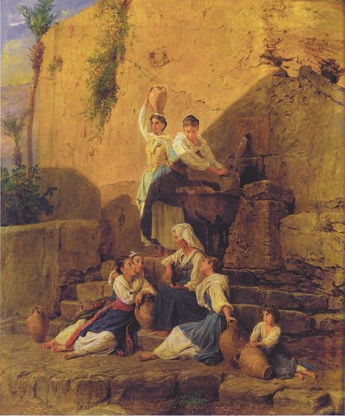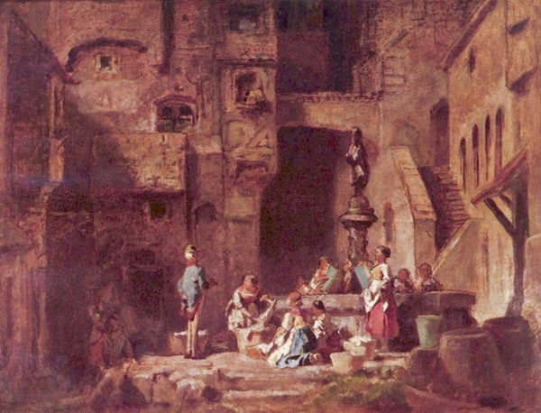 Curator: Here we have "Rome. Italian Courtyard" by Fyodor Bronnikov. What strikes you first about it? Editor: A pervasive sense of melancholy. The light seems to be fading, casting long shadows, and the figures feel rather isolated despite their proximity. Is it just me, or is there a slightly ominous undertone? Curator: Perhaps it's the realism mixed with a hint of romanticism that lends that feeling. Bronnikov was a master of detail, wasn't he? Look at the textures of the stone, the worn steps, the rendering of light on the children's faces... he brings the scene to life, or at least, presents its life as it existed. The play of light and shadow is masterful. It almost has a Baroque feel, despite its rather ordinary subject matter. Editor: Ordinary, maybe, but observe how he arranges those figures. It feels less like a candid snapshot and more like a carefully constructed tableau, no? It speaks to some underlying societal structure or power dynamic. Like a frozen moment in some unspoken play. Are we sure it's realism? Curator: Good question. Bronnikov embraced realism as it was informed by his own sensibilities. We can consider the painting as genre art, or academic art, capturing everyday life but imbued with the artist’s personal vision. Notice the donkey left of the scene: some travelers must be journeying here. Perhaps a merchant looking for a place to sell. There's a narrative begging to unfold beyond what we see, and it keeps the eye moving. The vertical composition does well in highlighting the architecture. Editor: Yes, and how that donkey almost seems to fade into the shadow, a looming reminder of the harshness outside that idealized courtyard. It contrasts sharply with the bright clothes of the figures sitting on the stairs! It pulls me in – I keep thinking, 'what’s next'? There’s an unresolved tension I find intriguing. Curator: Bronnikov definitely achieved something special here – a beautiful depiction of ordinary life tinged with a bit of mystery and the fleeting nature of such moments. Editor: Precisely, it’s a picture not just to be observed, but to be felt. Almost like stepping into a forgotten memory.