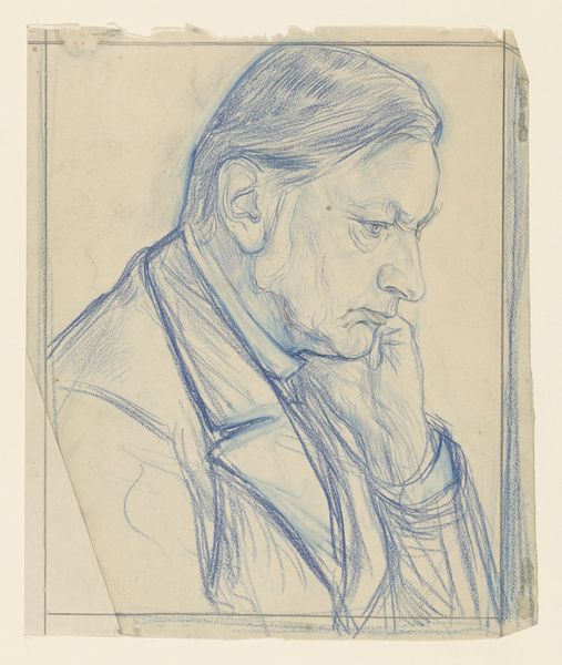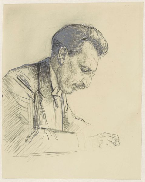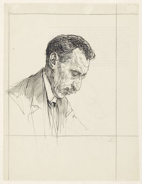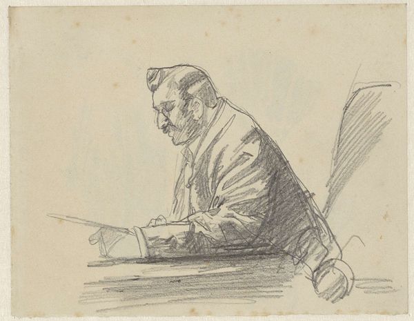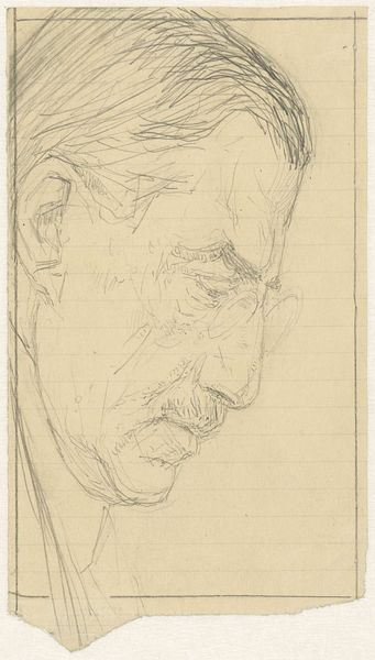 Editor: This is a pencil drawing by Jan Veth, titled "Portret van P. Visser, profiel naar rechts," dating from between 1874 and 1925. I’m struck by the intimacy of this sketch. It feels very immediate and personal. How do you read this portrait? Curator: This work invites us to consider the power dynamics inherent in portraiture itself. Whose gaze is centered? Whose story is being told, and by whom? The subject, P. Visser, is shown in profile, almost in a state of introspection or perhaps even subservience, with his gaze directed downwards. What does it mean to capture someone in this way? Editor: So, are you suggesting it’s not just a simple portrait, but perhaps a statement about social position? Curator: Exactly. Consider the historical context: the late 19th and early 20th centuries were periods of intense social stratification. Artists were often commissioned by the elite to produce portraits, which reinforced existing power structures. By rendering Visser in this subdued pose, is Veth commenting on the subject's status or perhaps even questioning the very act of portraying someone for posterity? Do you get a sense of whether this portrayal is empathetic or critical? Editor: I see what you mean. There’s a delicate balance, I think. It could be either. The light pencil work almost feels…gentle? But there’s also a certain detachment. It makes me wonder about Veth’s relationship with his subject. Curator: And that's precisely the point. Art invites us to ask those questions. What societal roles are in play here? This is what truly enriches our experience of the work, inviting a critical reflection. Editor: That’s given me a completely new perspective on what a portrait can communicate. Curator: Indeed, it can transcend simple representation to offer complex commentaries on identity, power, and representation. Editor: Thanks, I'll never look at portraiture the same way again.