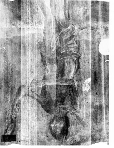 Curator: What we have here is an X-radiograph of "Satyrs chasing Nymphs", attributed to Honore-Victorin Daumier. It resides in the Harvard Art Museums collection. Editor: My initial impression is one of hidden processes; seeing the skeletal structure beneath the paint gives it a ghostly quality, like looking at its artistic DNA. Curator: The very act of creating an X-radiograph transforms our engagement. It shifts the focus from the artist's hand to the scientific gaze. Editor: Absolutely! It reveals the layering, the underpainting—the very materiality that built this artwork, which, in its time, would have been hidden during creation. Curator: It's fascinating to consider the cultural implications: Daumier, known for social satire, depicted scenes of pursuit and power, a theme that resonates even through this radiographic filter. Editor: And this allows us to analyze the labor involved in creating the piece itself, questioning traditional ideas of artistic genius being separate from material execution. Curator: Indeed, a potent reminder that art is more than just what meets the eye, even in a traditional museum setting like this one. Editor: It’s the bones of the thing, isn’t it? The raw materials telling a new, revealing story.