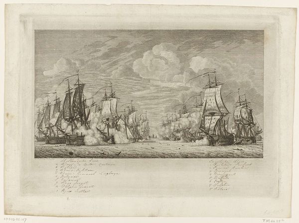 Curator: This fascinating image, created around 1783 by J. Weuyster, depicts "The Action off Dogger Bank (5 August 1781)". It's an engraving with ink and colored pencil on paper, capturing a naval engagement. Editor: My initial impression is one of stark order and looming power. The geometric precision in the ships’ formations contrasts sharply with the implied chaos of naval conflict. Curator: Absolutely. The formal arrangement of the ships—rows upon rows facing each other—highlights a structured dance of aggression. Consider how Weuyster uses line and form to communicate depth. Note, in particular, how the receding ships become less defined, reinforcing the idea of distance. Editor: That deliberate arrangement is fascinating. These ships represent not just vessels, but emblems of nations clashing for dominance. This battle itself, the action off Dogger Bank, gains deeper symbolic resonance, especially since it lacks figures; all is power, represented via structure. The battle becomes more of an act. Curator: Precisely. And the visual language itself serves to reinforce that national identity, what ships represent. But it's not just about what's shown; it's about the relationship of line, shape, and form in creating the representation itself. Editor: What stands out is how this visual representation memorializes naval power. The engraving itself has the symbolism of that power of a specific nation at that moment, captured for generations to see. This is no simple fight at sea. It's cultural memory, strategy and naval strength preserved, a visual narrative meant to bolster national identity. Curator: An insightful interpretation. By prioritizing structure and symbolism over realism, the artist has created a powerful commentary on power and order that resonates through time, across generations. Editor: And on the nature of cultural memory itself. These are emblems we project onto the past, transforming these prints into icons that reflect—and shape—our own identities and ambitions, and understandings of what a ship can represent.