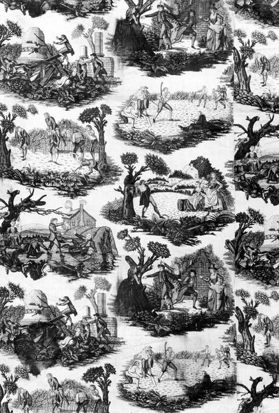 Charles Abraham Chasselat designed this furnishing fabric, "La Vie de Jeanne d'Arc," which now resides at the Art Institute of Chicago. Upon initial viewing, the monochromatic textile presents a densely populated tableau. The narrative unfolds in a repeating pattern, each scene delineated by subtle variations in scale and composition. Chasselat employs line and form meticulously, creating a dynamic interplay between foreground and background. The absence of color directs the viewer's attention to the intricacies of the draftsmanship, enhancing the fabric's textural depth. The choice of textile as a medium subtly destabilizes traditional art hierarchies, bringing the epic narrative of Joan of Arc into the domestic sphere. Each repeat mirrors the cyclical nature of history and memory. The linear nature of the pattern encourages us to contemplate the artwork not just as a static image, but as a field of signs that invites continuous interpretation.