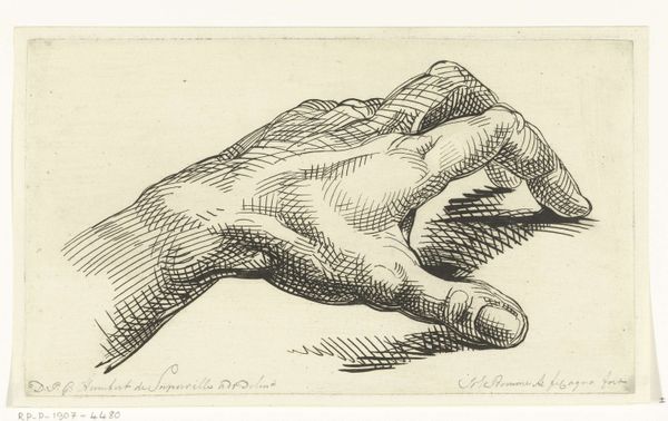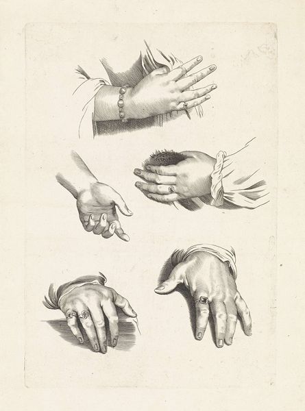 Curator: The piece before us is titled “Twee handen,” or "Two Hands," by Jean François Janinet, created sometime between 1773 and 1777. It’s an etching and print drawing, currently residing here at the Rijksmuseum. Editor: My initial impression is one of anatomical precision and restrained elegance. The subtle earth tones of the drawing contribute to this impression. Curator: Indeed, Janinet's mastery is evident in the delicate hatching that models the forms. Consider the attention he gives to the articulation of each finger, the tendons, the subtle gradations of tone… a masterful rendering in a purely academic sense. Editor: But the “why” interests me most. Why hands? Hands were historically signifiers of labor. Whose hands are these, and what societal role did they perform? We see them divorced from action. I also find the multiple views… It's a common training method, no? Curator: Precisely. These preparatory sketches were standard practice in academic ateliers of the 18th century, serving as models for aspiring artists learning anatomy and form. The drawing displays academic art principles. Editor: I'm curious if prints like this were meant for public consumption. Who had access to such artistic skill in depicting a laborer’s hands, given their social status at the time? Curator: Likely circulating among artists and collectors, not necessarily the public at large. The accessibility of prints allowed a wider audience to study master's techniques. These drawings were tools of artistic transmission. Editor: So, in effect, while ostensibly a study, the print itself is playing a part in a system of reinforcing artistic hierarchy and instruction, influencing tastes. Curator: It's also vital to think about the shift in art patronage. It shifted from private aristocracy to the larger population through such means as exhibitions and printed editions, so it gave broader visibility. Editor: In considering those historical details, you appreciate that beyond an aesthetic appeal of mere technical merit and how artistic styles are constructed and distributed to the wider community to create our accepted aesthetics. Curator: Yes, indeed. We witness how these details converge into an interesting art piece of history.