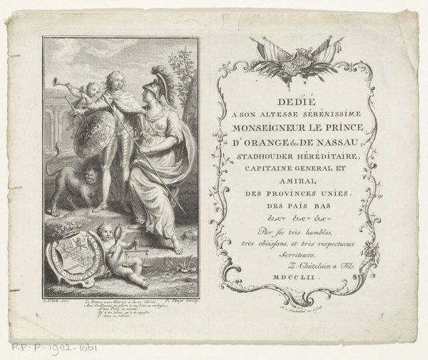 Johann Andreas Pfeffel created this print, "Opdracht met Mercurius en een riviergod," whose exact date is unknown, but it resides in the Rijksmuseum. The artwork presents an intriguing intersection of classical mythology and civic dedication, deeply embedded in its historical context. Rendered in detailed engraving, the piece features Mercury, the fleet-footed messenger of the gods, alongside a river deity, embodying the confluence of commerce and nature. The figures, rendered in classical style, flank an inscription dedicated to the magistrates and senate of Frankfurt, highlighting the social function of art in paying homage to civic leadership. The artwork reflects the 18th-century fascination with classical antiquity, yet it does so in service of contemporary political structures. Pfeffel uses traditional allegorical figures to laud the virtues of the city's governors, suggesting an alignment between their rule and timeless ideals. The print invites us to consider the dialogue between past and present, and the ways in which art can reinforce or question the narratives of power and authority.