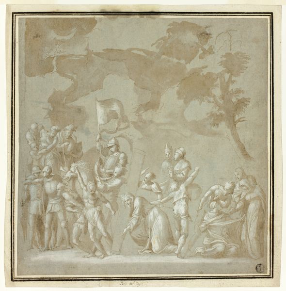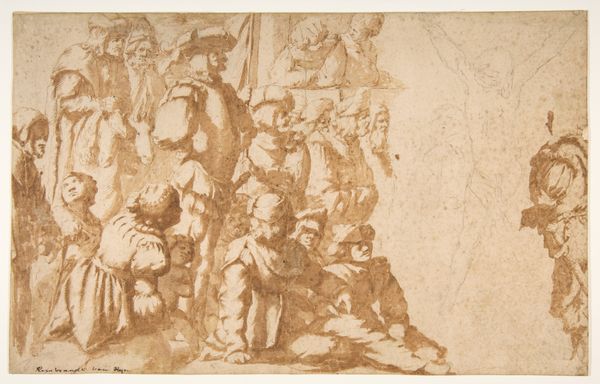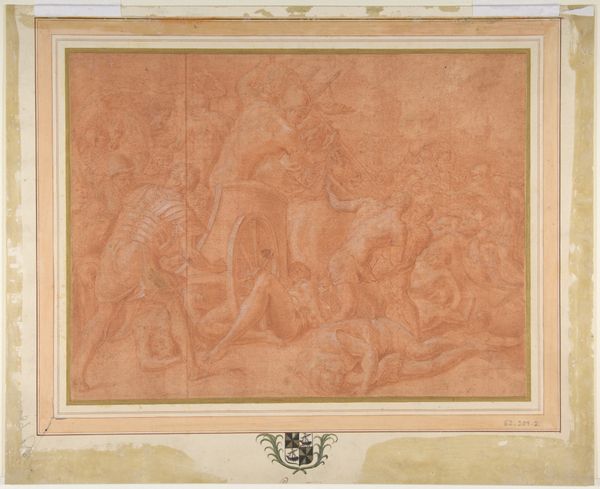 Editor: Here we have "Elia opfert in Gegenwart von Ahab," made around 1557 by Antonio Campi. It's a drawing done with red chalk and ink on toned paper. The whole scene has a warm, almost monochromatic feel, and the figures are packed together. How do you interpret this work, focusing on its composition? Curator: The composition immediately draws attention. Campi has masterfully used the oval format to create a sense of dynamism and contained energy. Notice how the figures are arranged – there's a clear recession into depth, guided by the converging lines and the diminishing scale of figures towards the background. The High Renaissance favored symmetry and balance, and though present here, the dynamism certainly challenges that standard. The foreshortening used, what does that communicate to you? Editor: I see that the foreshortening really adds to that feeling of depth, but it also makes some of the figures seem a little bit… distorted? Almost like they’re bursting out of the picture plane? Curator: Precisely. It's this tension between idealized form and representational accuracy that is at play. Consider how Campi employs line. He’s not merely defining forms; he’s using line to create texture, shadow, and a sense of movement. Do you notice a difference in the application of ink and red chalk? Editor: Yes, the ink seems more deliberately outlining the figures, while the red chalk is used for shading and gives them a sense of volume. So, the contrast between those two creates depth. Curator: Exactly. That contrast, that interplay, creates visual interest. Campi has chosen a specific medium – red chalk on toned paper – and through his skill in manipulating line and form, he conveys not only the scene itself, but also the very process of artistic creation. That final unity allows this High Renaissance piece to endure through today. Editor: That’s a great observation, seeing how much thought went into the medium itself and the impact it has. I appreciate that, thank you! Curator: My pleasure, the process is just as interesting as the product in art, is it not?