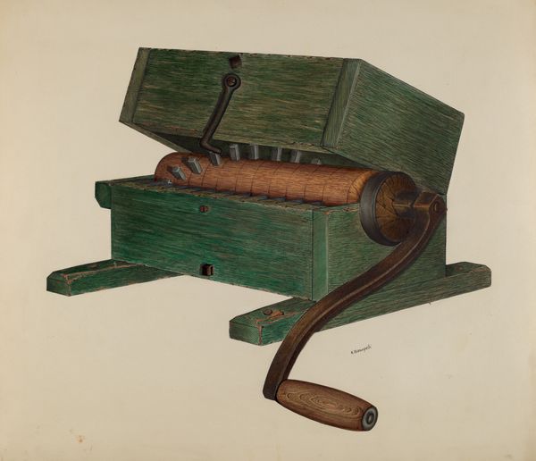 Editor: Here we have Max Unger’s "Bead Plane," a watercolor and charcoal drawing from 1939. It’s surprisingly captivating for a picture of a woodworking tool, it has this real sense of... presence. What do you see in this piece? Curator: I see an interesting intersection of the artist and the everyman. Unger is making a fine art study of an object from daily life, potentially elevating it. Who would have encountered this work, and where? This was during the Great Depression and it's made under the Works Progress Administration. So what statement does it make when the government commissions art of tools like this? Editor: It feels… celebratory in a way? A celebration of the working class? Curator: Exactly. This was during a period when American art and identity were being explored and defined. These artists were consciously turning away from European trends. Everyday objects, regional subjects...they all played a part in the new American art narrative. What do you think of the composition? Editor: It's simple, but really highlights the texture and craftsmanship of the plane itself. The shadows give it dimension. Curator: Right, but consider how Unger is presenting labor. This isn't a heroic scene of a worker, it’s a quiet, almost reverent portrait of the tools themselves. This artistic choice speaks volumes about the value being placed on labor and craftsmanship. Do you see that scrap of wood in the bottom left? Editor: Yes! I hadn't paid much attention to that until you pointed it out. Is it supposed to be representative of Unger? Maybe a carpenter trying to cut and refine, in parallel with the artist's job of depiction? Curator: That could be the case. This art highlights the process of creation and celebrates that which is often taken for granted. And perhaps to look closer, and understand the context in which it was produced is crucial in how we see the world, today. Editor: I never considered how something as simple as this could be connected to broader social movements. Thank you for opening my eyes! Curator: And thank you! It’s enriching to discuss such thought-provoking topics, today.