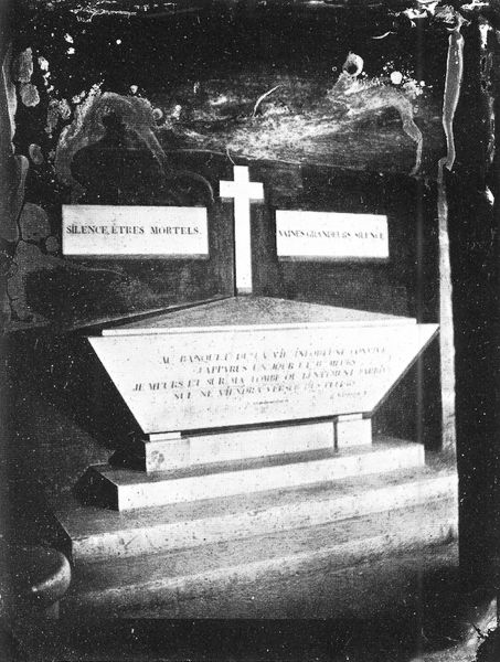 Curator: This gelatin-silver print, titled “Catacombes De Paris,” was captured by Felix Nadar around 1861. It plunges us into a shadowy space. Editor: My first impression? Eerie elegance. The monochrome palette casts a haunting aura, with what appears to be a plaque fighting against the encroaching darkness. It is an unsettling invitation, isn't it? Curator: Indeed. Nadar was a pioneer in the then-nascent field of photography, particularly his use of artificial light in these underground spaces. This image becomes more than just documentation; it's about how technology unveils the hidden. We should recall Paris’ history here too—replete with revolutions, imperial ambition, stark class divides. Do you see a connection here to urban underbellies and marginalised groups of people? Editor: Absolutely, because Paris’ underbelly also speaks of the precarious lives that are systematically buried under its structures of power. Nadar's use of light almost feels like a reclaiming or rescuing from the shadows, as the print invites us to meditate on the ethics of our vision: What do we choose to illuminate, and what do we leave in the dark? Curator: The romanticism style underscores that point, really playing up the sublime and emotional encounter, making the image a personal and, dare I say, aesthetic experience. I love the slight blur of the background that contrasts against the hyperreal textures on that slab. How does Nadar’s photograph move our understanding of landscape? Editor: It really inverts it! Landscape traditionally denotes the outside world and the beauty of nature, but here we descend to an inside landscape, where the supposed natural order gives way to death, history, and collective memory. This print serves as a great reminder that every landscape is marked with hidden histories, that can in turn be illuminated to speak truth to power. Curator: So it makes you wonder, doesn’t it, if Nadar felt like he was capturing the soul of the city itself down there in those depths? Editor: Definitely! This journey isn’t just geographical; it is also a profound sociohistorical expedition, echoing feminist notions of excavation that ask us to question the very grounds on which the past is built, and unearth histories in service of forging more liberated futures.