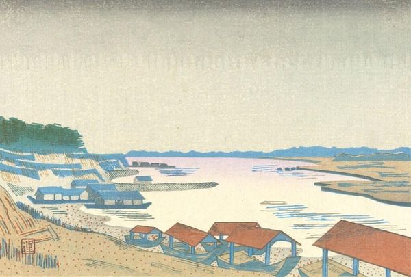 Editor: This is "Overlooking the Huangpu River," a watercolor by Fujishima Takeji from 1938. It feels so atmospheric, almost like a hazy memory of a bustling port. What's your take on it? Curator: It feels like looking through the artist's soul, doesn't it? That window frame...it’s almost like we are glimpsing into someone else’s reality, mediated through their particular view of the world, a quiet moment amidst the clamor. Doesn’t it remind you a little of Japanese woodblock prints in the way it presents a framed view of nature? What feelings does the perspective evoke in you? Editor: That's an interesting point. The frame definitely draws my attention, creating a feeling of both intimacy and distance. Is this a typical example of Orientalism? Curator: Orientalism is one reading. I tend to be quite sceptical when that label gets slapped on something so effortlessly! But I think it speaks of longing and the artist trying to catch a piece of time slipping away from us, especially knowing this was painted in 1938, right on the brink of…well, everything that happened in the forties! There is such beauty, isn’t there, in things being just a little bit fragile? Do you get that sense, too? Editor: Absolutely, that vulnerability shines through, making it more impactful! The watercolor style, in particular, seems fitting for such a wistful piece. Curator: Indeed. It also is such a beautiful contradiction, too! It feels both firmly located in a time and a place, and so desperately transitory. Editor: Well, I definitely have a deeper understanding of this artwork. It goes far beyond just the beautiful scenery, doesn't it? Curator: Precisely. That little window serves as a profound reminder to see the beauty in the mundane before it becomes a fleeting image from our past. It's like a poignant, watercolor haiku.