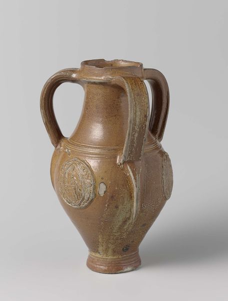 Curator: Here we have an intriguing example of late 16th-century stoneware, specifically a jug attributed to Jan Baldems Mennicken, crafted in 1599. Note the elaborate ornamentation – coats of arms mingle with depictions of a pelican and griffins. Editor: It looks rather serious for something meant to hold liquids. There’s a formality about the thing…it's like a pronouncement instead of just, well, a jug. Almost…regal. Curator: That "regal" quality stems from the symbolism meticulously etched onto the stoneware. Coats of arms, of course, signal status and lineage. But beyond mere heraldry, consider the bestiary. Editor: The what-now? Bestiary? Curator: It's like an illustrated encyclopedia of animals, real and mythical, each imbued with symbolic weight. The pelican, for example, often represents piety and sacrifice, feeding its young with its own blood in some traditions. The griffin, vigilance and strength. These aren’t casual choices. Editor: So, this isn't just showing off some family crest. It's like broadcasting values or principles? Public service announcement via pottery? Curator: Precisely. It speaks to a culture where visual symbols served as a potent language. Each emblem communicates ideals, aspirations. Editor: The sheer detail, all pressed into clay... that's wild. And it's not a gentle scene. More like powerful forces interacting. Not exactly light refreshment vibes. More like… a declaration. Curator: Absolutely. Its intended function serves as secondary. The jug becomes a canvas for propagating dynastic image and ideals through symbolically loaded iconography. This fusion transcends utility. Editor: I keep picturing the people who commissioned and used it, though… sitting around a table. You’re sharing the wine and declaring allegiance to family symbols, a past ideal? Seems heavy, that kind of constant performance of belonging. Curator: It reinforces communal and ancestral identities within a context where such affirmations were crucial for maintaining societal coherence. Now when one examines the jug… Editor: Hmm. This chat makes me appreciate even utilitarian objects contain cultural statements that speak to the people, eras and intentions of where they come from, just begging for attention. I hadn’t really expected that today! Curator: Indeed. Material objects often offer such unexpectedly eloquent testimony regarding cultural values if we care to understand their silent vocabulary.