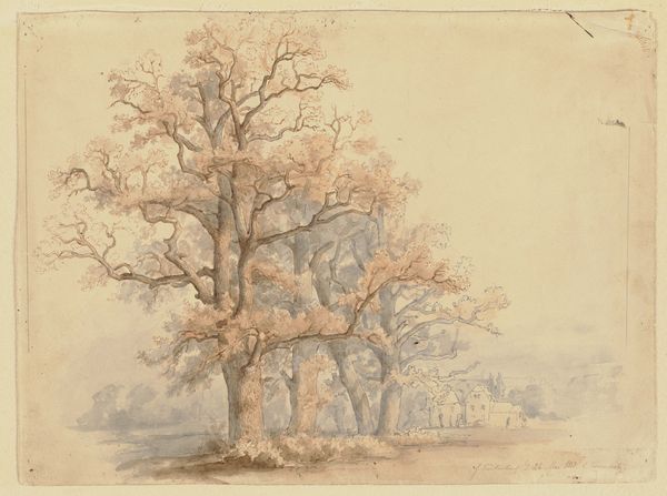 Curator: Look at the dominating presence of the tree in this watercolor, ink and graphite artwork titled "A Landscape with an Old Oak (or Beech) Tree," created by Joseph Mallord William Turner around 1791-1801. It’s currently housed here at The Met. Editor: It has this somber yet hopeful quality. It makes me reflect on aging, fragility, and nature's capacity to outlive us. The subtle variations of color emphasize the passing of time in some ways, it feels very evocative, though somehow still… restrained? Curator: Yes, restrained, perhaps. Romanticism often intersects with a deep awareness of mortality. Turner situates this specific tree, with its imposing solitary stance in what appears to be cultivated grounds; suggesting, perhaps, humanity's relationship with an otherwise wilder nature. How it dominates yet blends in, like aristocracy itself at the time. Editor: I’m struck by the ambiguity. On one hand, you could say it is nature tamed, or perhaps nature allowed its dominance, regardless of who cultivated the area. What’s clear is Turner, through composition and light, asks questions regarding agency, in how he renders both nature and society. Who is really shaping whom? Curator: The sociopolitical landscape was fraught with such questions back then as well, as old systems started to crumble during the French revolution. Here you also feel how that tree is simultaneously powerful, a being almost beyond reckoning, yet utterly exposed, vulnerable, to any force that chooses to target it. A single lightning strike could undo centuries of growth. Editor: Absolutely, that precarious balance! And also that we as the audience are allowed this view, a literal surveying, like we too have some claim to the land. How complicit are we then in our relationship to nature and property, given that our own presence shapes that very relationship. What stories are being overlooked to allow for such a clear, sweeping landscape? Curator: A crucial point; those power dynamics are certainly embedded in Turner's choice of perspective and framing. And I see the same sentiment mirrored today in questions surrounding land access, ownership, and conservation efforts. What narratives do we choose to foreground in our contemporary dialogues around nature? Editor: Thinking through that complexity definitely makes experiencing this piece a layered journey. There are no easy answers, and to me that's the beauty of it.