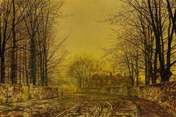 Curator: Ah, here we have "In the Park," a drawing made around 1900 by Karl Nordström, part of the collection at the SMK. It seems to be executed primarily in pencil or graphite. Editor: It’s haunting, isn’t it? Somber. I'm drawn to the layering of graphite – you can practically feel the tooth of the paper and the weight of the artist's hand in rendering that stark path. Curator: Indeed. Nordström employs the park—a location often associated with leisure—to delve into much darker symbolic territories. Parks have often served as symbols of both societal control and potential escape. Here, that shadowy path beckons toward the unknown. Editor: Look at how he builds up those dense areas of shading, mimicking the light as it struggles to break through the canopy. It’s clear he understood his materials deeply; graphite isn't just a sketching tool here, it's the very atmosphere itself. What kind of social function might this public space have served? The means and cost to enter it? Curator: In art of this era, that chiaroscuro treatment, the strong contrast of light and shadow, almost always underscores a sense of drama or unease. Note, for instance, how those bare trees reach up, almost like grasping hands. Nordström infuses a sense of foreboding and precarity in a landscape meant for respite, speaking volumes about society's unconscious anxieties during a period of change. Editor: The deliberate choices behind a medium like graphite – cheap, readily available – suggest that this scene of apparent upper-class leisure might not be completely accurate. The artist is perhaps hinting at unseen social stratification by framing nature, normally open and welcoming, to also show restriction and gloom. I'd like to consider whether paper stock influenced production. Curator: Fascinating! It illustrates the way artistic interpretation changes with shifts in historical understanding. I came away with a fresh perspective. Editor: Exactly! Now, to me, it evokes this artist was trying to show his unease as well. It really gives you something to ponder!
