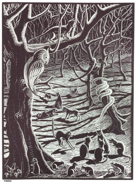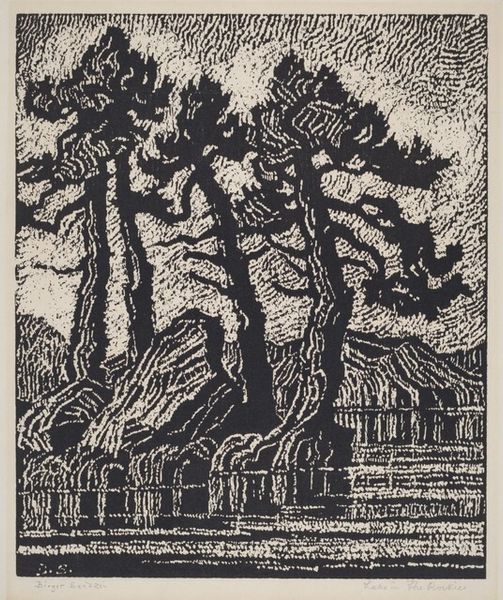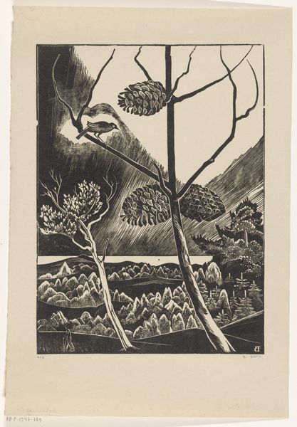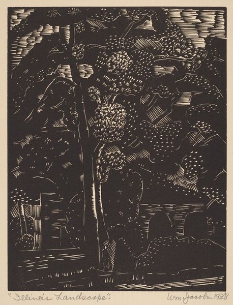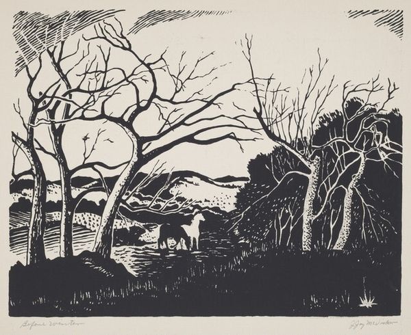 Curator: “Skating in the Park,” made by Blanche Small, is a lovely woodcut piece offering an intriguing window onto a winter scene. What are your initial impressions? Editor: Stark. The high contrast between black and white, created by the woodcut technique, immediately evokes a crisp, cold atmosphere. The stark lines have a nervous energy. Curator: Yes, the black and white contributes so much, doesn't it? I think the choice of black ink against the bare paper conjures the stark reality of winter, reflecting its often unforgiving character as a time of hardship, especially for city dwellers, though not always devoid of some play. Do you see any narrative symbols emerging here? Editor: Beyond the obvious cityscape in the background? The way the lines create a sense of movement, particularly across what appears to be a frozen pond, where tiny figures are, presumably, skating... It makes you consider perspective and how form translates into energy. The figures are diminutive, aren't they, reinforcing a sense of the individual against the wider cityscape. Curator: The tiny figures are compelling! I read them almost like symbols of resilience, celebrating communal winter activities such as ice skating to overcome hardship. Even the barren tree in the center could be a symbol of winter's austerity, starkly yet enduringly silhouetted. What do you think about the cityscape blending in the background? Editor: Right—and if we consider that this is called "Skating in the Park", a traditional, almost Arcadian theme meets an industrial one in the urban landscape that peaks in between the composition... However, as you indicate, the tree does indeed dominate. The bold curving line of the trunk against those delicate branches is striking. It suggests a dichotomy in its rendering – stark yet somehow sheltering. Curator: Nicely put! I like that contrast: an urban space which then evokes natural spaces like an arcadia through recreation, play and figuration! It gives the work a layered symbolism. The whole picture almost feels dreamlike. Editor: Definitely, it is dreamlike... considering the deliberate yet simplified rendering and contrasting aesthetics... All in all, a rather fascinating study of contrasts in this simple print. Curator: Agreed, the simple execution enhances its poignant effect. A reminder that even seemingly simple forms can carry layers of significance.