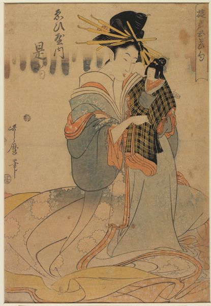 Curator: Utamaro's print, "Standing Woman in Court Dress with a Seated Woman and Child," presents a snapshot of 18th or 19th-century Japanese life. I find the composition immediately striking; the elongated figure of the standing woman looms over the intimate scene below. Editor: It's somber, almost melancholic, despite the vibrant robes. The woodblock feels delicate, yet the layers of color suggest a complex production process. Curator: Indeed, the materiality speaks to the artistry involved. The print provides insight into the social hierarchy and gender roles of the era, where courtly elegance and motherhood intersect. Editor: And consider the labor involved in creating those intricate textile patterns! It makes one think of the artisans behind the scenes, the craftspeople often overlooked in discussions of "high art." Curator: Precisely. Viewing it from a feminist lens, we can explore the confined roles assigned to women, even within the upper classes. Editor: Reflecting on the materials brings us closer to understanding the social conditions that shaped this artwork and its makers. Curator: Ultimately, this print invites us to consider the confluence of aesthetics, identity, and societal expectations. Editor: Agreed. It is a potent reminder of the interconnectedness of art, labor, and the lives of those who create and consume it.