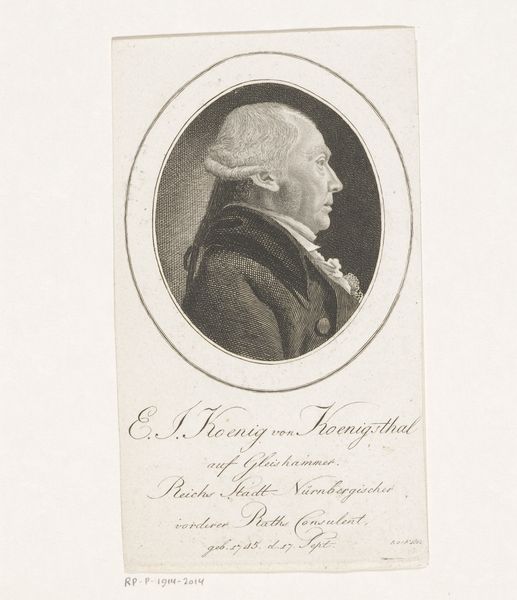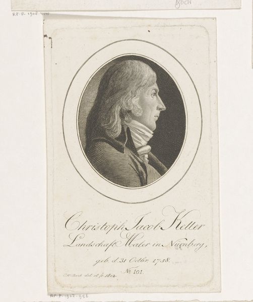 Curator: Ah, I'm immediately struck by the graphic simplicity—it's crisp, almost like a cameo. Who is this austere fellow? Editor: That’s Johann Erhard Kraemer. It's a portrait, thought to have been crafted between 1799 and 1836, rendered in print, drawing, and engraving on paper by Christoph-Wilhelm Bock. You can currently find it at the Rijksmuseum. Curator: Bock certainly captures the neoclassical aesthetic. It’s more than just a likeness; it evokes a sense of enlightened self-possession. Look at that defined jawline, the carefully styled hair… it all speaks to the era's ideals. Editor: True. And I feel like he’s not entirely comfortable, there is something severe but soft in his gaze and I wonder what narrative his pose attempts to veil or to enhance about his position. Curator: The framing itself reinforces that sense of controlled presentation, doesn't it? That perfect oval suggests a deliberate construction of image, almost a symbol of social identity. Think about how portraiture in that era served to project a certain persona. Editor: Right. I think Bock understood this and cleverly let the light illuminate Kramer. It feels revealing, as if saying that to project any kind of identity needs to allow others a glimpse of our deeper selves. Curator: Definitely, and that light is really quite delicate. This little work is much more potent and enduring than it appears, the portrait has retained its capacity to signify beyond its mere execution, thus opening our imaginations through centuries. Editor: Well, this artwork whispers an intimate familiarity, almost as though time itself wanted us to witness something authentic and special and this image is its attempt to unveil that sentiment. Curator: Beautifully put. It leaves you contemplating the fleeting nature of individual lives within the broader sweep of history. Editor: Indeed. It reminds us of how interconnected time and individual experiences really are.