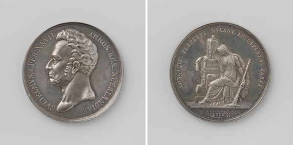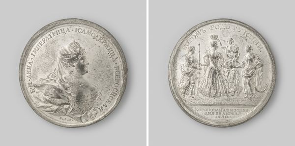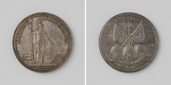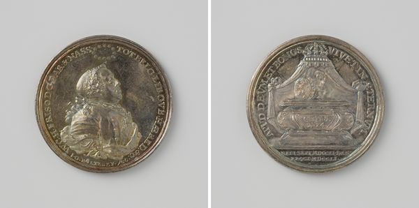 Curator: Let's turn our attention to this fascinating metal sculpture. It’s titled “Peace of the Pyrenees, at the meeting between the French and the Spanish King” and was created sometime between 1699 and 1703 by Jean Mauger. Editor: It looks so...official. Almost aggressively diplomatic, you know? Like they're trying really hard to sell the idea of peace. And the wigs! I could get lost in those baroque swirls forever. Curator: Indeed! These commemorative medals, as objects, held considerable socio-political power. They weren't merely artistic expressions; they were tools of statecraft, circulated to solidify the image of Louis XIV, here "Ludovicus XIII Rex Christianiss" King of France. The event this represents, The Peace of the Pyrenees, marked the end of a long conflict between France and Spain and reshaped the power dynamics of Europe. Editor: Ah, so a bit of spin, then. History bronzed, or in this case, silvered! But look at the way those figures are rendered, it's so stiff! I can almost feel the weight of expectation bearing down on them. The shaking of hands, a bit underwhelming maybe? As the dawn of diplomacy… I can't put my finger on it. Curator: The scene on the reverse, showing the royal meeting, is rendered in a rather conventional baroque style. Notice the deliberate emphasis on the regal bearing of both monarchs, and the inscription Pax Aut Turnas --Peace and you should leave. Also keep in mind these images were meant to convey a certain narrative to those viewing and holding the sculpture in their hand. Consider its distribution: to diplomats, nobles, wealthy merchants to impress. Editor: Definitely! But thinking beyond the PR, I like pondering about the real people—Louis XIV, for one. Stuck in those elaborate clothes, those expectations…it humanizes everything, in a slightly pathetic way. Curator: Exactly. Objects like this offer us valuable access point to the machinations and myth-making that underpinned early modern European power. Editor: Yeah. It's like holding a little piece of propaganda, but a beautiful one. Makes you wonder what our coins and medals will say about us centuries from now!