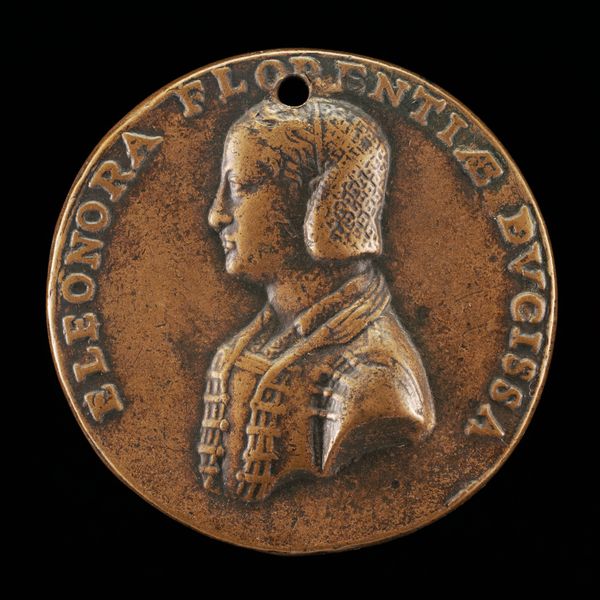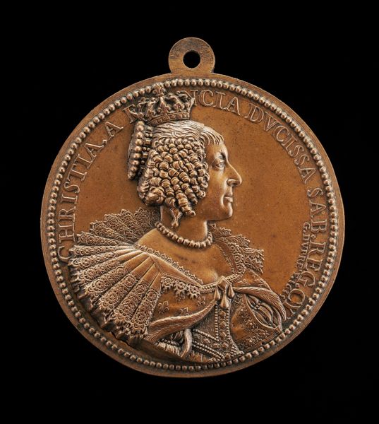 Editor: So, here we have a bronze relief, a portrait medal of Louis XIII from 1623, sculpted by Guillaume Dupré. There’s something quite striking about the profile, so sharply defined against the circular form. How do you read its composition? Curator: It is immediately evident that Dupré utilizes the circular format not merely as a boundary, but as an integral element that accentuates the royal profile. The curvature of Louis XIII’s brow and nose mirrors the coin's edge, establishing a visual harmony. Notice also the calculated juxtaposition of textures: the smoothness of the background offset by the intricate detailing of his collar and hair. How does the texture interplay affect your perception? Editor: I hadn’t noticed how his collar and hair command your focus. There is a very deliberate contrast between those meticulously-rendered details and the figure-ground relationship. Do you see the inscription framing the portrait as simply informational, or does it play a formal role as well? Curator: The inscription serves both an informative and compositional role. Note how its serifs and consistent letter spacing contribute to the overall texture and rhythm of the work, serving as a visual counterpoint to the figural details at the medal's center. This integration transforms text from mere label to compositional component. Editor: That’s fascinating. The medal feels so unified now. I hadn't thought of the inscription as more than just text, but you've helped me see it as another part of the artistic texture of the object. Curator: Exactly. Formal analysis allows us to perceive not only what is represented, but how representation itself shapes our understanding.