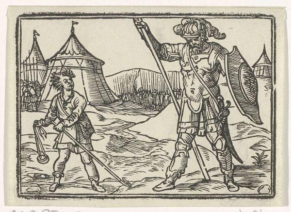 Editor: This is a woodcut illustration by Albrecht Dürer, titled "Heauton Timouroumenos, from The Comedies of Terence, 19th century reprint," dating back to between 1485 and 1528. It depicts two figures in what appears to be a tense confrontation. What historical context should we consider when approaching this image? Curator: It's important to acknowledge the artwork's basis in the Roman playwright Terence's work and understand Dürer's role as a conduit between classical thought and the Northern Renaissance. Consider how the visual language echoes social hierarchies. Are these figures presented as equals, and how does their attire contribute to our understanding of their identities and relative status in the society that Dürer lived in? Editor: The figure on the left, pointing accusingly, is much more elaborately dressed. The other one looks...scared? Is it simply about wealth disparity? Curator: Not simply wealth, but power. Dürer's time was rife with shifts in power dynamics, religious reformation, peasant revolts… The body language, the clothing – these are all coded signs. Who has the authority to accuse, and who is subject to it? What systems of belief would these people have subscribed to that might explain that power imbalance? Editor: So, we’re looking at this scene not just as an isolated story, but as a reflection of broader power structures prevalent at the time. It's fascinating how the art becomes a document of its era. Curator: Precisely! And by considering it through lenses of class, gender, even burgeoning capitalist structures, we unpack not only the historical context, but also the continuing relevance of art's engagement with issues of dominance and marginalization. What are your final thoughts about that, connecting it to now? Editor: I see how understanding that historical context provides such a powerful lens for analyzing the visual narrative. Considering social identities adds layers of meaning. Thank you, this really helped open up the piece for me.