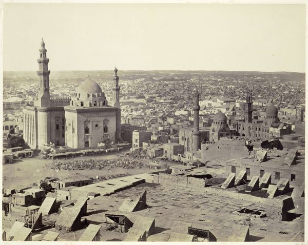 This photograph of Cairo was made by an anonymous artist, date unknown. We can assume that it was made in the late 19th century, when photography was used to document the architecture and urbanism of non-western cities, especially in places under colonial control. The image shows a dense urban environment dominated by religious buildings and mosques. What can we learn from photographs such as this? The formal qualities of the architecture depicted here create meaning through historical associations. We can see visual evidence of the rich history of Cairo through its buildings. The photograph also tells us something about the culture of the time it was made. It provides insight into the European fascination with and consumption of imagery depicting non-western cities. More research into photographic archives, travel writing, and colonial history will help us to more deeply understand the social conditions that shaped the production of this artwork.