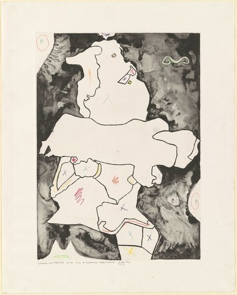 Curator: Jasper Johns' linocut print, "Green Angel 2," created in 1997, is before us now. Editor: It's stark, isn't it? Like an echo from a dream half-remembered, all monochrome whispers and fractured forms. Makes me feel a little uneasy, if I’m honest. Curator: Consider how Johns embraces printmaking here, a medium often perceived as more 'democratic' or reproducible than painting. His choice highlights questions of artistic labor and the multiple, pushing against traditional notions of the unique art object. Editor: I see what you mean, but for me it's that layering of shapes. There's an ethereal quality, almost as if the angel is dissolving, being remade. It brings this sense of continuous, restless change. Curator: Look at the material texture—the deliberate roughness achieved through linocut. Every cut, every mark left on the block and transferred to paper, bears the trace of his hand and deliberate interventions. It subverts the easy reproduction of prints. Editor: Exactly! The starkness allows those subtle variations in texture to sing. Those speckled areas almost feel like dust motes dancing in a forgotten corner. There’s beauty in this… disintegration? It reminds me of how impermanent everything is, which, in the right mood, can be inspiring. Curator: We might even explore the role of institutions in shaping perceptions. How is it different to view this as opposed to seeing it perhaps originally intended, which was possibly bound to the pages of a book or journal? Editor: Hmm, interesting. In that context, does it become less of a declaration, more of a whisper to be discovered? It gives us the chance to bring ourselves into the piece. Curator: Absolutely. We've explored process and the means of its creation. A reevaluation. Editor: So, next time you dream and forget, try a linocut, maybe you’ll catch a stray angel. Thanks.