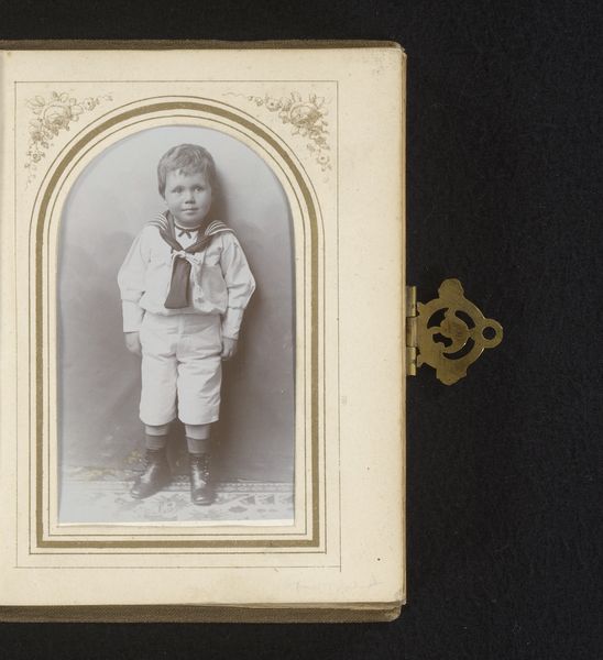 Louis Robert Werner captured this photograph titled "Portret van Casper Albertus Bon," using the albumen print technique. Notice the interplay of shapes and lines that structure this petite portrait. The oval vignette containing Casper contrasts with the rectangular frame, softened by rounded corners. The young subject's striped sailor suit provides a repetitive pattern, a visual rhythm offset by the smooth planes of his face and hands. This juxtaposition invites us to consider the tension between individual identity and social roles, themes common in 19th-century portraiture. The sepia tones lend the image a sense of timelessness, while the deliberate composition emphasizes the formal qualities of the photograph itself. Werner's approach creates a sense of structure that transcends mere representation. The artwork invites ongoing interpretation, reflecting broader artistic and philosophical concerns about representation and identity.