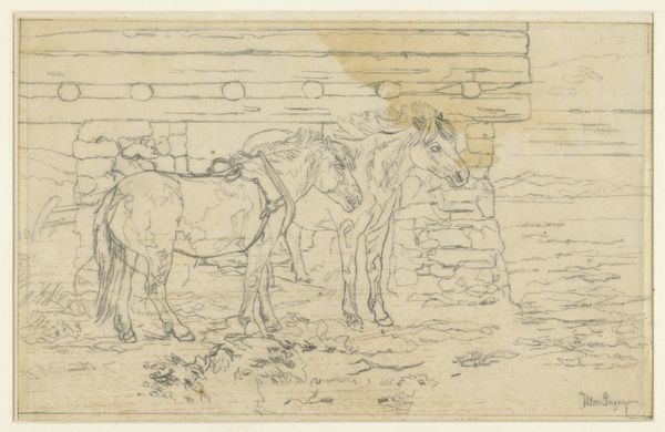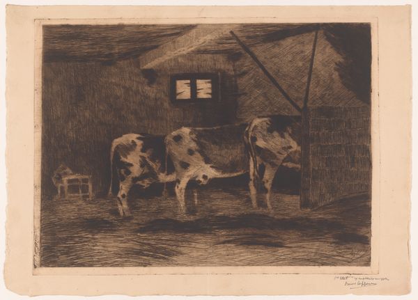 This is "The Interior of a Stable with a White Horse and Two Cows" by Johan Thomas Lundbye. Immediately, one notices the composition's emphasis on verticality, achieved through the wooden beams that dissect the scene. This structural framework divides the space and our gaze, creating a sense of enclosure. Lundbye contrasts this rigidity with the soft, rounded forms of the animals. The palette is subdued. Earth tones dominate, punctuated by the white horse, with a semiotic interplay of warmth and coolness. These elements are not merely descriptive; they function to challenge conventional representations of rural life. The use of perspective and the interplay of light and shadow destabilize fixed meanings, prompting questions about our relationship with the natural world. Lundbye's formal choices push beyond traditional landscapes to challenge viewers to reconsider their own positions within cultural and philosophical discourses.