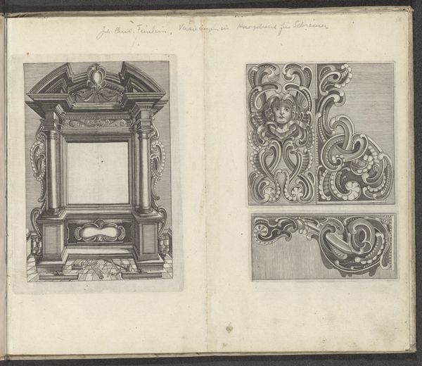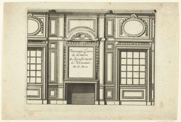 Nicolas Langlois created "L'Architecture a La Mode ou sont les Nouveaux Dessins pour la Décoration des Bâtimens et Jardins" using engraving. The print presents a symmetrical arrangement of architectural elements, primarily focusing on interior wall designs. The use of line is meticulous, creating a sense of order and clarity. The composition is divided into distinct panels, each showcasing different decorative motifs from classical ornamentation to geometric patterns. Langlois employs the language of architecture as a system of signs. Each element, from the panels to the cornices, signifies a particular style or aesthetic value. The careful arrangement suggests a structured approach to design, reflecting the rationalist ideals of the period. The work challenges the traditional boundaries between art and architecture, proposing that design can be both functional and aesthetically sophisticated. The print functions as a visual catalogue, demonstrating how architectural elements can be combined and reinterpreted. This approach suggests that art is not just about individual expression, but also about the manipulation and reconfiguration of existing forms.