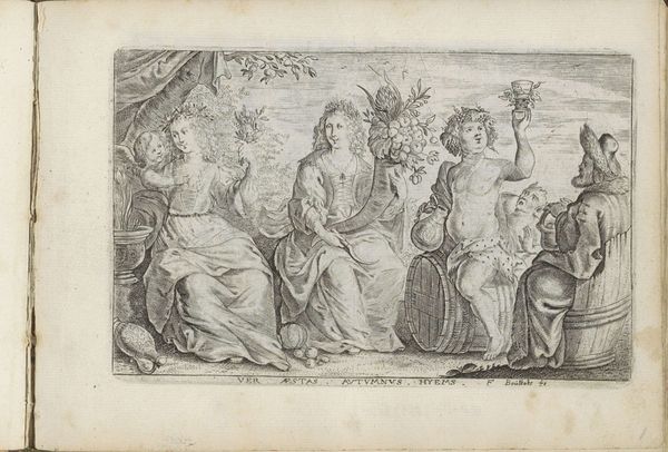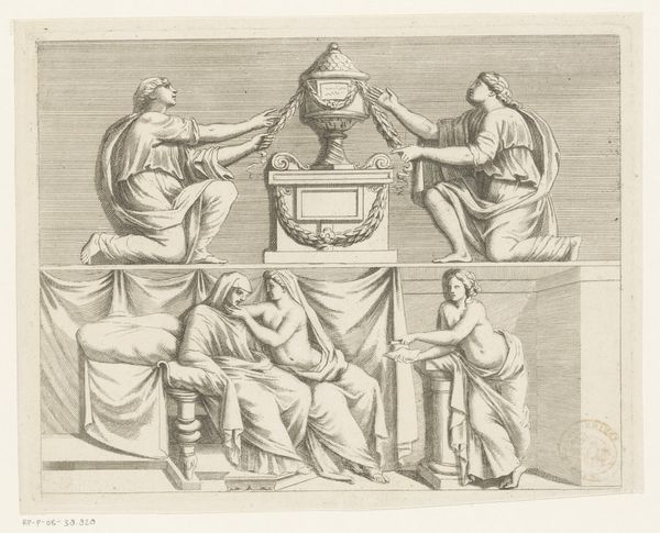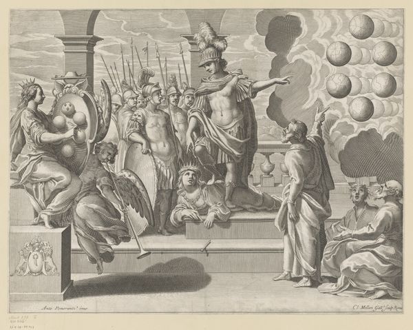 Editor: This is a rather fascinating engraving titled "Religie, Minerva en Vrede bij wapen van Claude Auvery." It was created sometime between 1608 and 1688 by an anonymous artist, and it’s currently held at the Rijksmuseum. It seems to be dripping in symbolism. What strikes you most when you look at this, say, as a story unfolding? Curator: Oh, stories upon stories, truly! The anonymity whispers of a past where craft overshadowed celebrity, doesn't it? When I gaze at it, I'm instantly pulled into a courtly drama. You’ve got Religie, that robed figure wielding a cross—almost like a scepter—next to Minerva, the brains of the operation, helmet nowhere in sight. Editor: Absolutely, I didn't even notice! And then Vrede? Curator: Peace, embodied in that nymph grasping the anchor, holding an olive branch. What’s curious, isn’t it, how Peace and Prudence often stand a bit separate from staunch Religion? Especially when they’re showcasing a noble’s arms! Have you considered the politics of the time? Editor: So, you’re suggesting this wasn’t just art for art’s sake? This feels like subtle...messaging, maybe? Almost as if saying, “My family brings religion, brains, and peace”? Curator: Exactly. It’s almost a family crest as campaign promise, distilled onto paper. Look how they each almost lend strength and meaning to that family shield. A bit blatant, I might argue, but elegantly done with those Baroque flourishes. Gives one pause, no? Art as persuasion, personality. Do we even see it that way now? Editor: That's so interesting to consider. I walked in just seeing the aesthetic, now I am looking closer at art as almost a contract of sorts. Fascinating! Curator: And now you have glimpsed the engine room where art becomes history, where intention and aesthetics waltz, sometimes clumsily, to the tune of their era.
