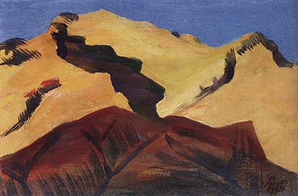 Editor: This is Martiros Sarian's "Landscape with Mountains. Surb Khach Rocks. Gohtan," painted in 1914, using oil and mixed media. It's really striking – the colors are so bold and the mountain forms are almost abstract. What do you make of this piece? Curator: Ah, Sarian. He always had a way of boiling down a landscape to its essence. To me, it feels like a memory, not a photographic representation, but more like the feeling of a place. Notice how he uses color, the dominance of ochre, the browns, even the little smudges of contrasting green… it all feels intensely personal. Editor: It does feel very subjective, not just something he’s seeing, but something he's feeling. What's your take on the brushstrokes? They look pretty deliberate and expressive. Curator: Exactly! See how they build the shapes? Each stroke feels like a breath, short and powerful. Sarian wasn’t just depicting mountains, but rather breathing life into them, letting them emanate a distinct feeling. The landscape is less about geographic accuracy and more about… a soulful resonance. Almost like a hymn. Do you catch the underlying tension there, too? Editor: Now that you mention it, yes! A tension between the solid forms of the mountains and the almost dreamlike quality of the colours and textures. Like a real place filtered through emotion. Curator: Indeed. It's an example of Expressionism where raw emotion is captured. I find myself wondering what Sarian was feeling in 1914 as he looked at these forms. Maybe a longing, perhaps even a melancholy reflection. I also imagine being there and seeing this amazing place. What a wonderful way to be invited into his memories, huh? Editor: Absolutely! I'll definitely look at landscapes differently from now on. Thank you for these insights!
