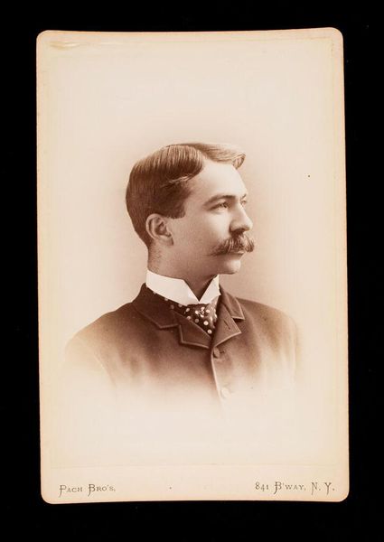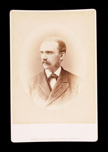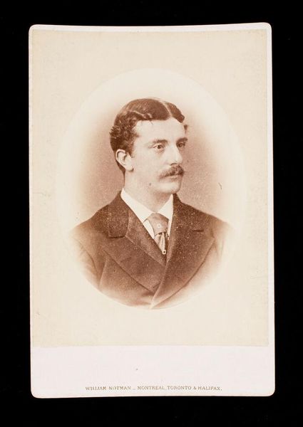 Editor: Here we have William Notman’s ‘Untitled bust length portrait of man,’ likely from around 1875. It’s a sepia toned photograph of a man with an impressive moustache! What do you see in this portrait? Curator: This portrait, typical of Notman's studio, presents a curated image of Victorian masculinity. How does the sitter's carefully groomed appearance—the moustache, the suit—speak to the construction of identity and status in that era? Editor: I hadn’t thought about it that way, but it does seem deliberately constructed. Curator: Exactly. It's less about individual expression and more about conforming to societal expectations of success and respectability. Considering the photographer's studio was in Canada, do you think about how this intersects with colonial power dynamics? Editor: That’s a really interesting way to frame it. Thanks!