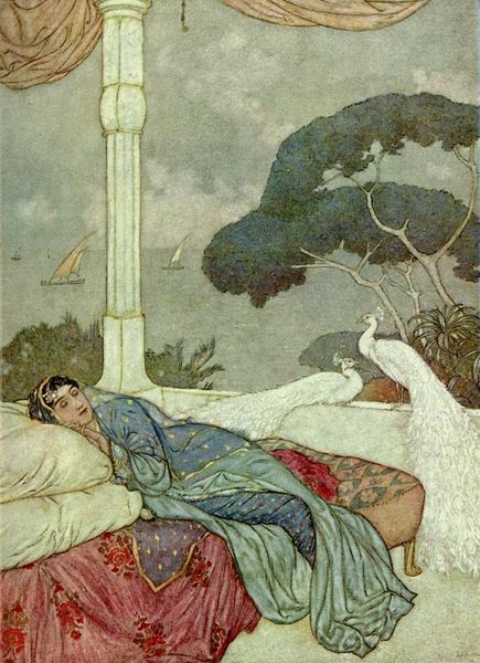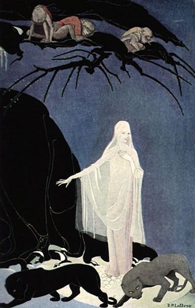 Editor: "A Circle of Mist," also known as "Stealers of Light by the Queen of Romania," is a watercolor by Edmund Dulac. There’s a dreamlike quality to it, the way the figures seem to drift in and out of the shadows. What do you see in this piece? Curator: Ah, it’s like peering into a forgotten corner of a fairy tale, isn't it? Dulac masterfully uses watercolor to create a sense of ethereality. The figures, almost spectral, seem to embody anxieties, the things that steal away our inner light. Look at the slumbering figure – are they succumbing to these shadowy presences, or merely dreaming them? Notice the owl, perched as a silent observer – wisdom or omen? Perhaps both, entwined. Editor: It feels heavy with symbolism, doesn't it? Almost like a modern take on Romanticism. Curator: Precisely! The symbolism is thick, layered like the mist itself. There is a connection here to our unconscious states – a land where vulnerability is heightened. And the Queen of Romania’s title—it infuses a peculiar literary weight, like a collaboration of shared dreaming. Tell me, what feelings does the owl evoke in you? Editor: Definitely a guardian of secrets. I hadn’t considered the Queen of Romania's contribution… it gives the piece another dimension! Curator: It adds another layer of narrative. The beauty of works like these lies in their capacity to resonate differently with each viewer. Ultimately, it mirrors our own internal landscapes, doesn't it? Editor: Definitely. Thanks! That perspective really sheds new light on the piece. Curator: My pleasure! I'll take with me that this piece, however surreal, is at its heart an attempt to touch on themes deeply, profoundly human.