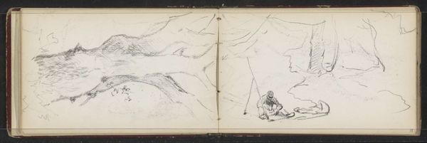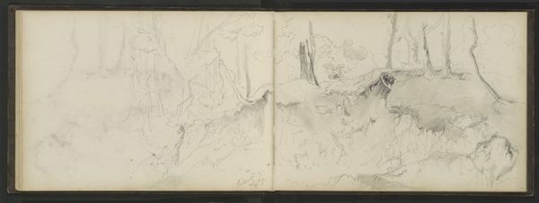 Curator: Ah, yes. Let's dive into this double-page drawing, “Bomen te Scheveningen” – or “Trees in Scheveningen” - by Willem Cornelis Rip. This piece, likely created between 1891 and 1898, captures a landscape using delicate pencil strokes. Editor: Immediately, I’m struck by how raw and unfiltered it feels. The hurried lines and contrasting pages almost scream ‘sketchbook’…like he’s just poured his first impression of this rugged landscape onto the page. Curator: Absolutely. It's interesting how the composition uses the book's spine to create distinct, contrasting environments. The left-hand side feels sparse and abstract with what looks to be some skeletal tree limbs, while the right bursts with detailed texture suggestive of dense foliage or even perhaps rough hewn wooden beams. Editor: I’m curious about his choices in contrasting strokes. On the left page, it’s this wild web, these near violent marks. On the right? Controlled, shaded... deliberate! The effect has to be on purpose. Could Rip be commenting on the tension between man and nature here or the beauty one finds from afar versus up close? Curator: That tension feels palpable, doesn't it? Considering Rip was associated with the Hague School, an impressionistic-influenced landscape movement focused on realistically depicting everyday scenes, could his artistic expression and approach align and create his personal story within the scene itself. Perhaps in each branch, Rip tells us what it’s like to navigate through artistic expression. Editor: The composition asks more questions than it answers! What I like best is, perhaps, its unassuming quality. You pass by sketches all the time, and you could very easily miss the way that Rip has framed and mirrored and almost challenged our vision of natural landscape. It is so delicate. Curator: Yes, exactly. What begins as a simple sketch unravels into such a compelling conversation about perspective and connection. Editor: For sure. And those fleeting glimpses he offers makes me wonder what Rip wanted to capture beyond just an observation but an encounter...