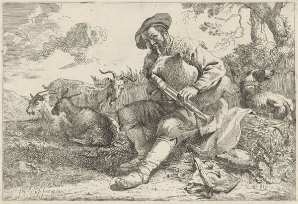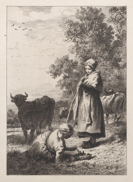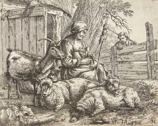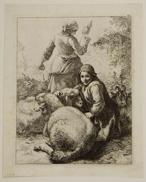 Francesco Londonio created this print, "Woman Spinner and a Shepherd with Flock," using etching and aquatint. The textured surface achieved through aquatint mimics the soft, woolly forms of the sheep, lending a tactile quality to the image. This printmaking technique, combined with the precise lines of etching, suggests a fascination with capturing the textures and surfaces of the material world. Look closely at the spinner's hands: she is holding a distaff, ready to convert raw fleece into yarn. This intimate portrayal connects directly to larger economic systems. During Londonio's time, wool production was a major industry, and images like these brought that process to the attention of the urban art market. Londonio elevates these rural tasks, prompting us to think about the labor and skill involved in textile production, and how these are often overlooked in favor of the finished product. By focusing on the making of things, we recognize the true value embedded within them.