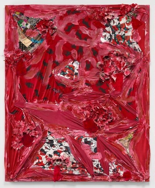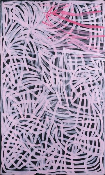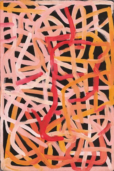 Curator: Here we have "Kame Awelye," an acrylic on canvas piece completed in 1995 by Emily Kame Kngwarreye. Editor: My initial impression is… intense energy. The overlapping lines feel almost frantic, a flurry of pale pink and white against that stark black background. It definitely grabs your attention. Curator: Indeed. Kngwarreye was an Anmatyerre woman and a prominent figure in contemporary Indigenous Australian art. This painting, like many of her works, relates directly to her connection to the land and her role as an elder. The marks she makes mimic and map the patterns found within her specific location. Her place, her Country. It's material memory, transferred into abstract line. Editor: Seeing it that way shifts things for me. The pinks now evoke the softer hues of the outback landscape at dawn or dusk, contrasted sharply against the darkness of the soil. Are the curving lines suggestive of geographical contours, then, or something more symbolic? Curator: It's multilayered, both literal and metaphorical. The 'Awelye' in the title refers to women's ceremonies and body painting. She references this painting tradition to illustrate her personal relationship with the ancestral stories belonging to her custodianship. She makes very gestural marks to convey not just physical place but cultural belonging, which of course, extends back tens of thousands of years. Editor: So, the composition echoes both the landscape's physical lines and the ceremonial body paint, which is then mediated through acrylic paints... Is it then an exploration of different traditions, merging them while simultaneously exploring an immediate sense of location and her relationship to her land? Curator: Precisely! Kngwarreye blends indigenous knowledge and materials from western cultures in order to find new expressions for old beliefs, she shows the means through which inherited custom, as well as ancestral belonging, can be sustained. This is a clear act of translation from physical knowledge into acrylic form. Editor: It’s incredible how a seemingly abstract work can carry such deep cultural and personal weight. You've given me much to consider. Curator: And hopefully offered some new perspective to our listeners! The ability of abstract work to blend material history and embodied belief is its strongest and most undervalued quality, and it speaks volumes to Kngwarreye's success here.