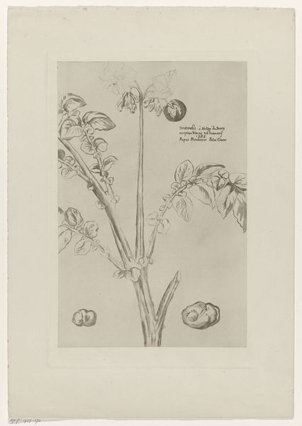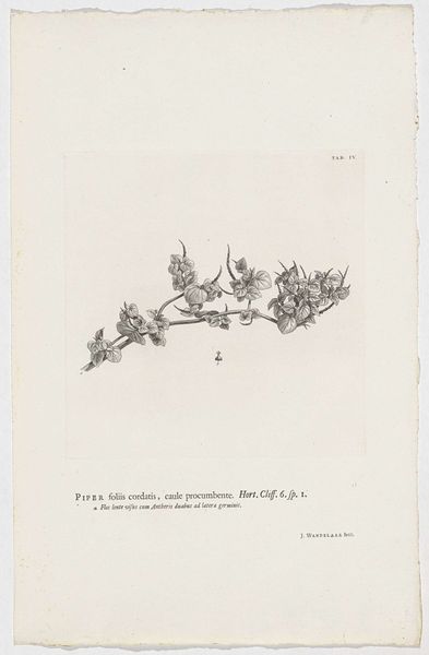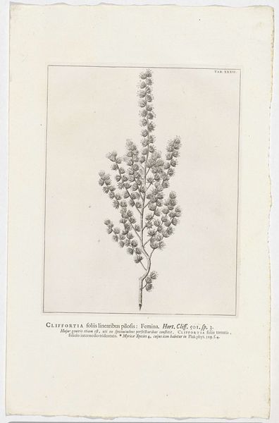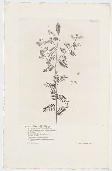 Editor: So, here we have "Cladanthus arabicus," a drawing and engraving on paper by Jan Wandelaar, from 1738. It’s currently held in the Rijksmuseum. It's remarkably precise, but also feels delicate, almost fragile. What do you see in this piece that I might be missing? Curator: The beauty resides significantly in the artist's masterful control of line. Observe the intricate network he has constructed to depict this botanical subject. How would you characterise the artist's approach to line – its quality and application? Editor: Well, it looks pretty uniform. Very consistent and even. Precise, but also maybe a little dry? Curator: Indeed. This uniformity serves a specific function, one typical of the academic style. It prioritises clarity and objective representation. We see this attention to detail not only in the plant itself, but also in the textual descriptions rendered with equal precision. Do you notice the arrangement of the plant, the relationship between the flowers and foliage, and how these are positioned on the page? Editor: Yes, it’s very symmetrical, almost geometric. The central stem provides a rigid anchor, and the flowers seem carefully positioned for balance. It feels very studied, rather than natural. Curator: Precisely. The engraving is not merely a depiction, but a careful articulation of botanical structure, rendered in line with scientific observation of the time. The evenness of line and studied arrangement elevate observation to abstraction. What does this rigorous process suggest to you? Editor: I hadn't considered that—it really makes me think about how artistic representation intersects with scientific inquiry. I was initially drawn to its fragile beauty, but now appreciate the complex way it embodies a pursuit of objective truth. Curator: A pursuit beautifully encoded in line and form.