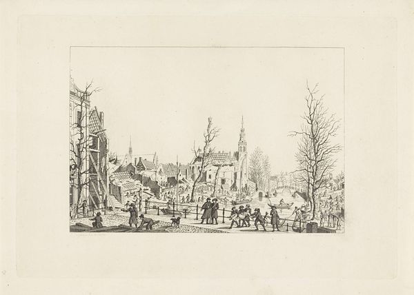Florent Nicolas Crabeels created this etching called 'Carnival Procession Through the City,' using a network of fine lines to capture a lively urban scene. The print is dominated by linear perspective that creates a sense of depth, drawing the eye toward the buildings and the church tower in the distance. The composition is structured around a central vanishing point, which is slightly off-center. This formal technique reflects the rapid urbanization of the late 19th century and the changing perception of space and movement within the city. Crabeels employs hatching and cross-hatching to create tonal variations, suggesting the effects of light and shadow and adding depth to the architectural facades. The figures are rendered with quick, gestural marks, capturing the energy of the carnival. The lines used by Crabeels offer a glimpse into the fleeting moments of urban life and how traditional celebrations were integrated into the modern urban environment.