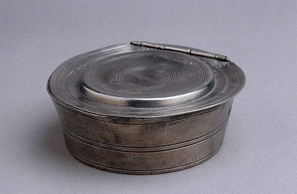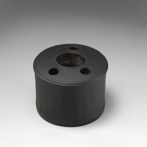 This vinaigrette box was made by William Thompson II out of silver. Its small scale and geometric form—an octagon with a circular lid design—give it a sense of contained precision. The subtle sheen of the silver suggests a tactile quality, inviting touch and interaction. What is fascinating here is the interplay between geometric shapes and material presence. The octagon, with its defined edges, contrasts with the smooth, reflective surface of the silver, creating a dynamic tension between form and texture. The circular motif on the lid further complicates this relationship, introducing a softer, more fluid element within the rigid structure. This interplay might echo broader artistic and philosophical concerns. The box's form reflects a period keen on rational order, yet the handmade quality introduces a subtle, human element that softens the visual impact. The vinaigrette box serves not just as a functional item but also as a site where geometry meets materiality, reflecting how objects carry both aesthetic and cultural meaning.