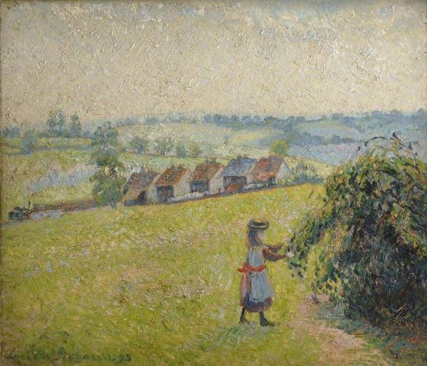 Editor: We're looking at Lucien Pissarro's "The Allotments" from 1918, rendered in oil paint, most likely en plein air. It evokes a sense of serenity and quiet labor. I’m curious about how the composition leads our eye through the scene. What structural elements stand out to you? Curator: Certainly. Note how Pissarro divides the canvas into distinct zones using color and texture. The foreground bursts with vibrant, loosely applied greens, contrasting with the smoother, more subdued hues of the middle ground where we see the earthy tones of the plowed fields and the buildings. Then, the background consists of a mix of mid-tone greens and greys. It’s almost like a study in contrasts. How do you feel this organization affects your interpretation? Editor: I suppose it creates a sense of depth, and the high vantage point invites us to appreciate the order of nature, perhaps. But it also feels intentionally segmented, even controlled. It is both picturesque and almost clinical. Does that make sense? Curator: It does indeed. The very visible brushstrokes, especially in the lower part of the composition, signal the artist’s active participation in shaping the scene. This impasto, combined with the clearly defined areas, creates a fascinating tension. We might then inquire into the effect of semiotic layering between, for instance, natural tones and geometries of cultivation and structure? How might a tension of forms be read? Editor: So, by examining the brushwork and spatial organization, we begin to unpack the layers of meaning that Pissarro embedded within "The Allotments". Curator: Precisely. Appreciating these intrinsic qualities allows for a more nuanced understanding of the artwork itself, regardless of extraneous biographical information.