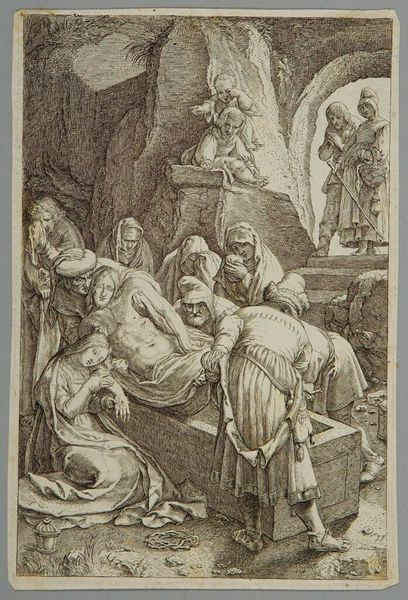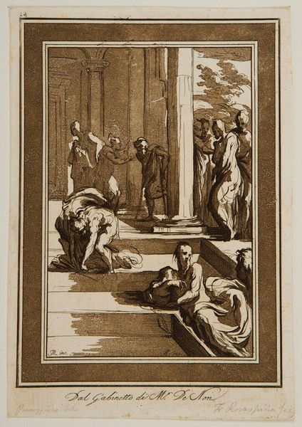 Editor: Here we have Ary Scheffer's "Witch of Endor," a drawing from around the 19th century rendered in ink and watercolor. The mood is definitely eerie, enhanced by the visible pen strokes and layered washes of color. What catches your eye when you look at this, our art expert? Curator: Immediately, I am drawn to the spatial relationships Scheffer constructs. Observe how he employs linear perspective to create depth, guiding the eye from the foreground strewn with bones to the arched doorway in the background. The strategic placement of figures and objects—the kneeling man, the central witch, the looming figure at left, the candelabra—creates a dynamic visual rhythm, contributing to the overall narrative tension. Editor: That’s interesting. So, you’re looking more at the composition and technique rather than, say, the story being told? Curator: Precisely. The narrative is certainly present, but I see it emerging from the formal arrangements. Note, for instance, the limited palette. Shades of grey and brown are deployed in varying intensities to establish contrast and volume. This economy of color reinforces the somber atmosphere and directs our attention to the key visual elements: gesture, drapery, and facial expression. Ask yourself, what do these formal choices communicate, beyond the literal depiction of the biblical scene? Editor: So, it’s less about what the scene is about and more about how the scene is made to look in the drawing? Curator: Indeed! And how these elements create visual meaning that words might not be able to capture alone. Editor: Okay, that’s a whole different way to look at art than I'm used to. I'll definitely keep the artist's choices in mind moving forward. Thanks!